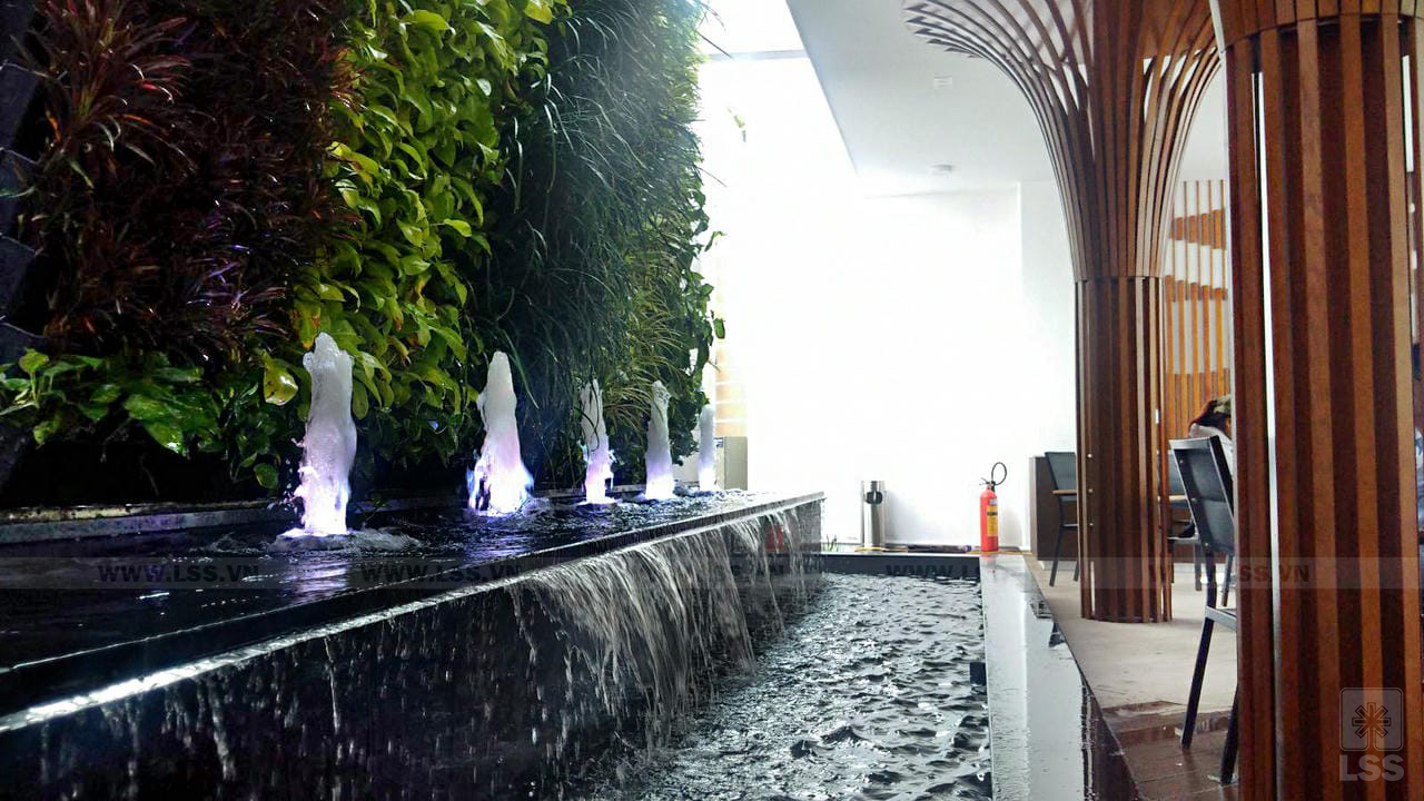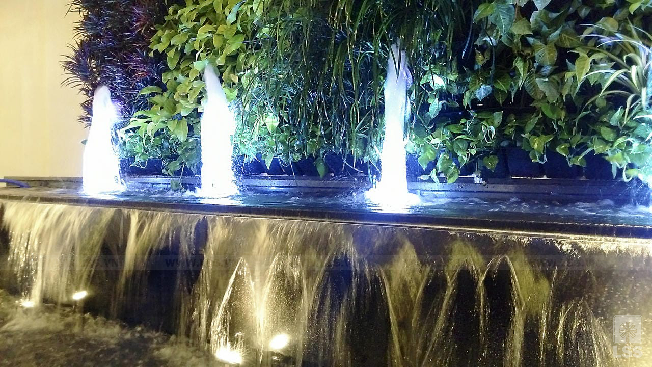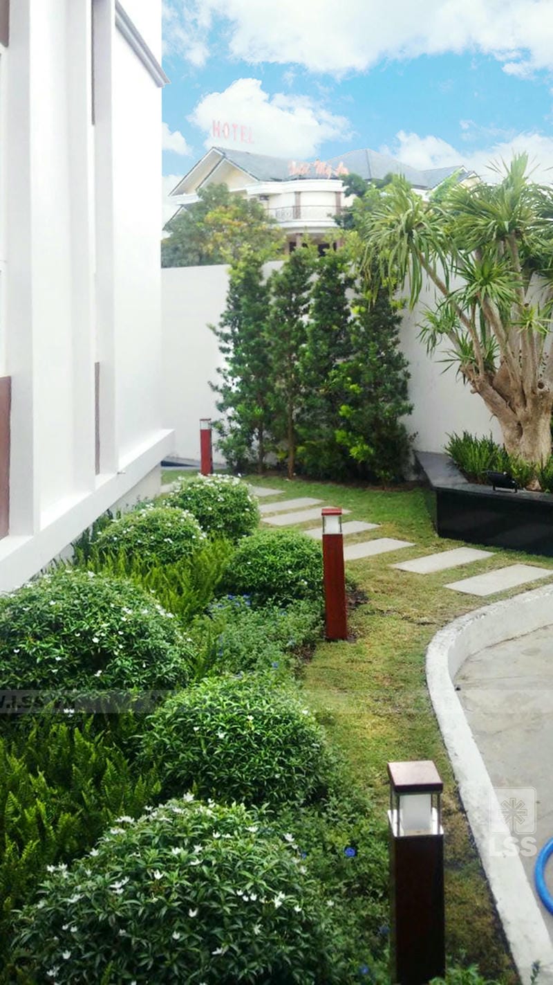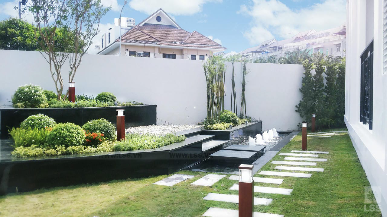 Khu vực biểu tượng logo của dự án nổi bật với chất liệu thép mạ vàng lấp lánh trên bề mặt đá vân nguyên khối, hai bên là dãy kim loại trang trí theo hình ảnh vươn cao mang đến sự sang trọng và đẳng cấp vượt bậc. Ngay bên dưới biểu tượng là hồ phun nước kết hợp công nghệ âm thanh ánh sáng thông minh chuyển đổi màu sắc theo thời gian nhất định mang đến cho tổng thể sự lung linh và vẻ thu hút khó cưỡng khi về đêm. Đối với cảnh quan khu nhà mẫu của dự án, LSS lựa chọn phong cách thiết kế hiện đại, giật cấp không gian các các bậc thang và bồn cây nhiều cao độ mang đến một hình ảnh mới lạ và đầy chiều sâu cho khu vườn. Thực vật được cắt tỉa col tròn, bố cục tinh tươm tạo nét tươi mới và gọn gàng, cạnh đó là hồ cảnh kết hợp đài phun mini làm tang thâm vẻ sinh động và bắt mắt cho khu vườn.
