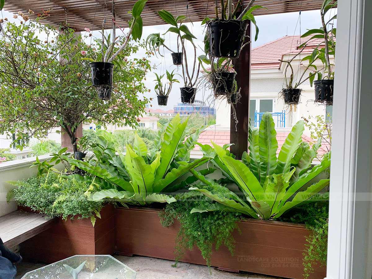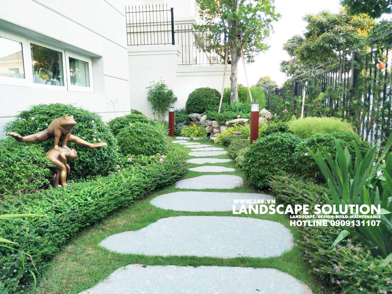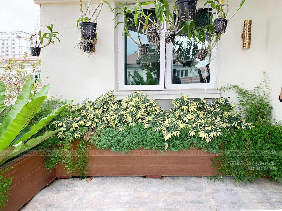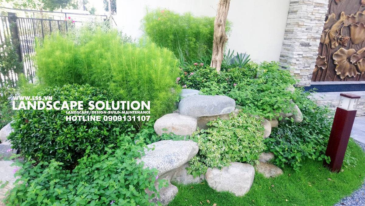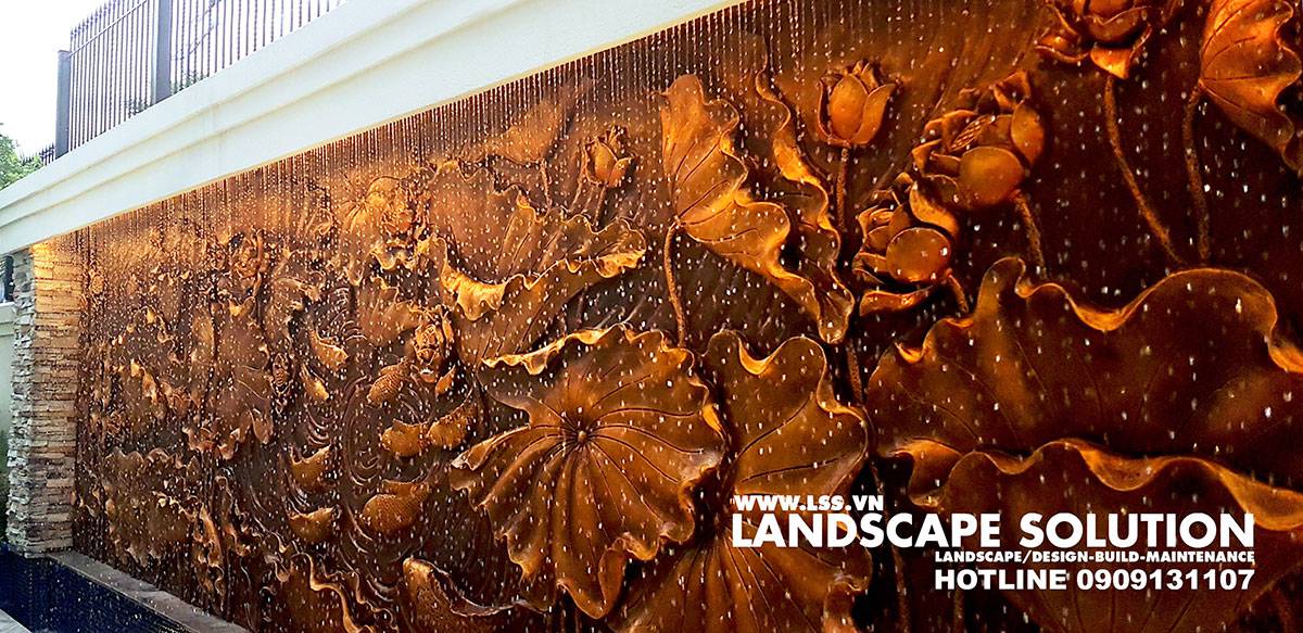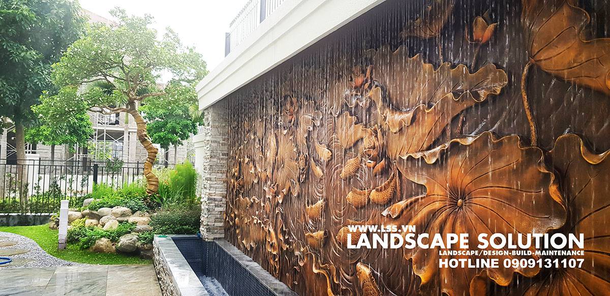 Dù diện tích sân vườn chỉ khoảng 400m², đội ngũ LSS vẫn bố trí hợp lý các phân khu chức năng và tạo nên một tổng thể hài hòa, thẩm mỹ. Luôn cập nhật kỹ thuật mới, LSS đã ứng dụng nhiều giải pháp sáng tạo như bức tường thác Sen mạ kim loại tinh xảo kết hợp hiệu ứng chữ thả trôi và đèn màu – chi tiết gây ấn tượng mạnh với mọi khách ghé thăm. Đặc biệt, hồ cá Koi “xuyên sáng” là điểm nhấn nổi bật và độc đáo nhất của công trình.