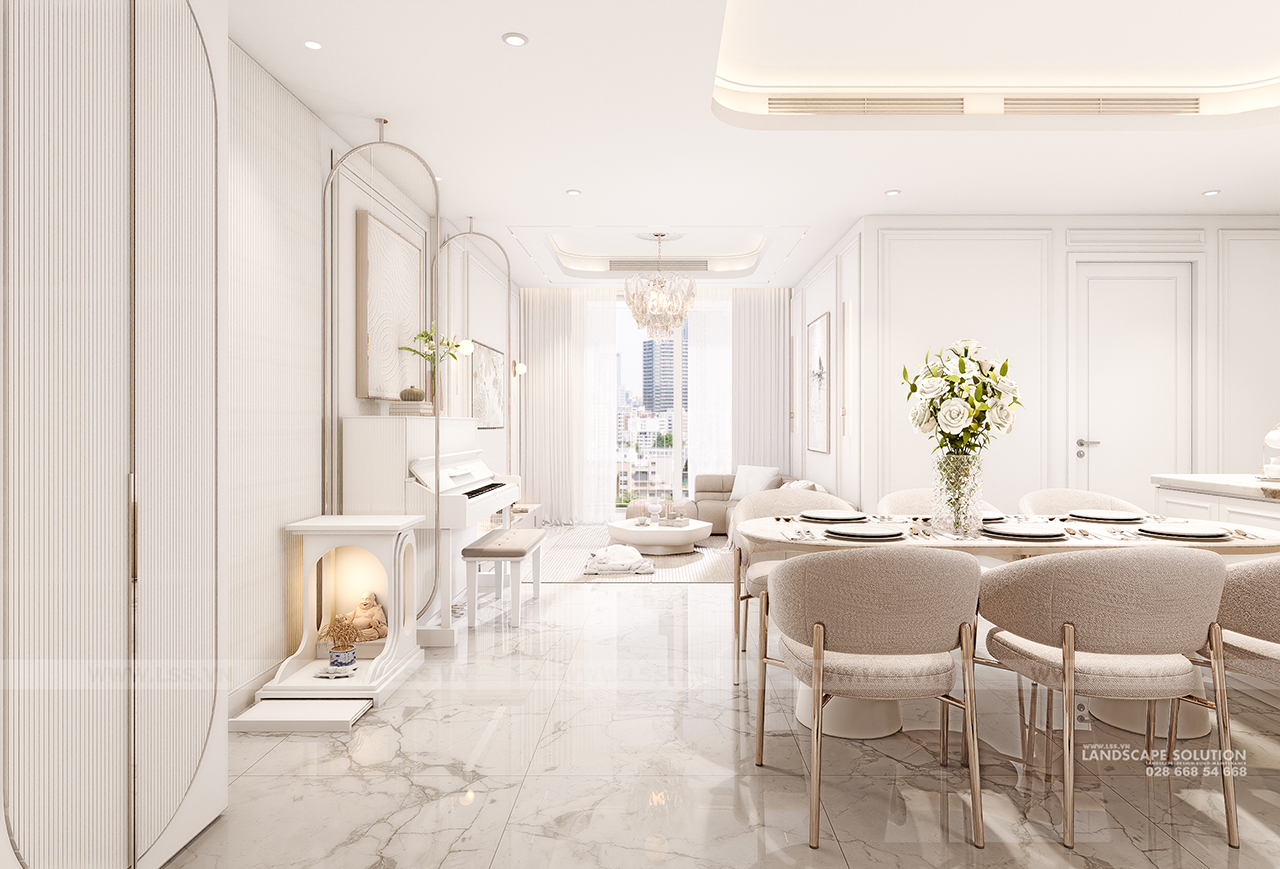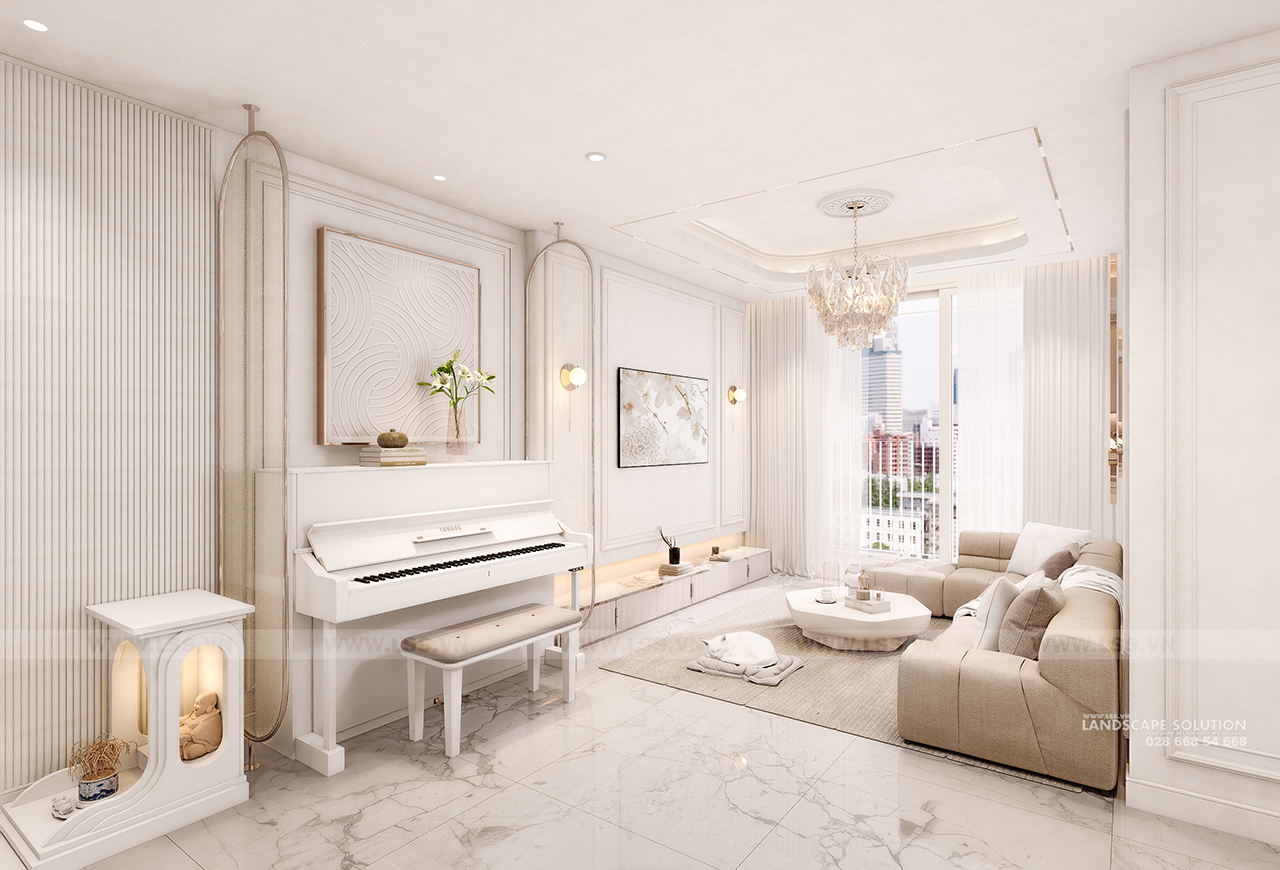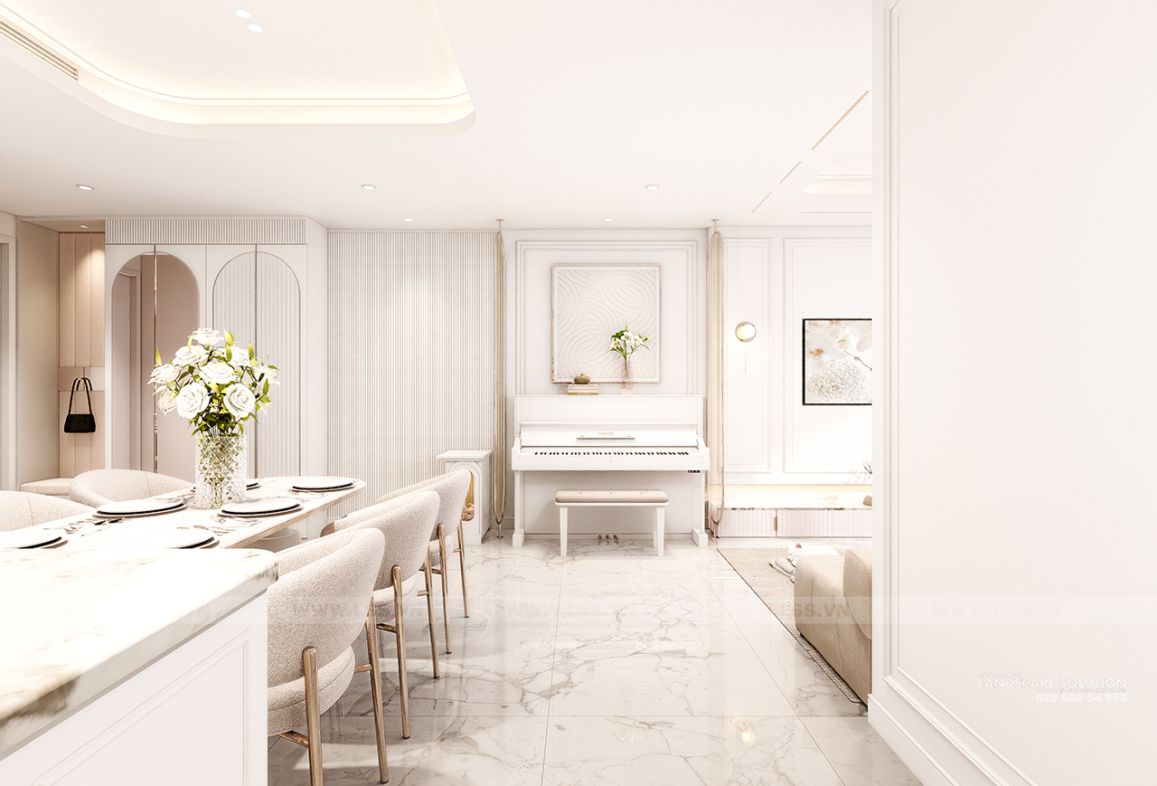 Bảng màu trung tính với tông trắng kem và be làm chủ đạo kết hợp cùng sàn gỗ xương cá ấm áp, tạo nên một phông nền hoàn hảo cho các món đồ nội thất. Mỗi chi tiết, từ những đường phào chỉ thanh mảnh trên tường, chiếc đàn piano trắng tinh khôi, đến hệ đèn chùm pha lê lộng lẫy, đều được LSS chăm chút để đạt đến sự cân bằng tuyệt đối giữa thẩm mỹ và công năng. Các vật liệu đá marble vân mây trong nhà tắm và khu vực bếp tiếp tục khẳng định sự cao cấp, trong khi những góc làm việc và kệ sách lại mang đến nét gần gũi, hiện đại.
