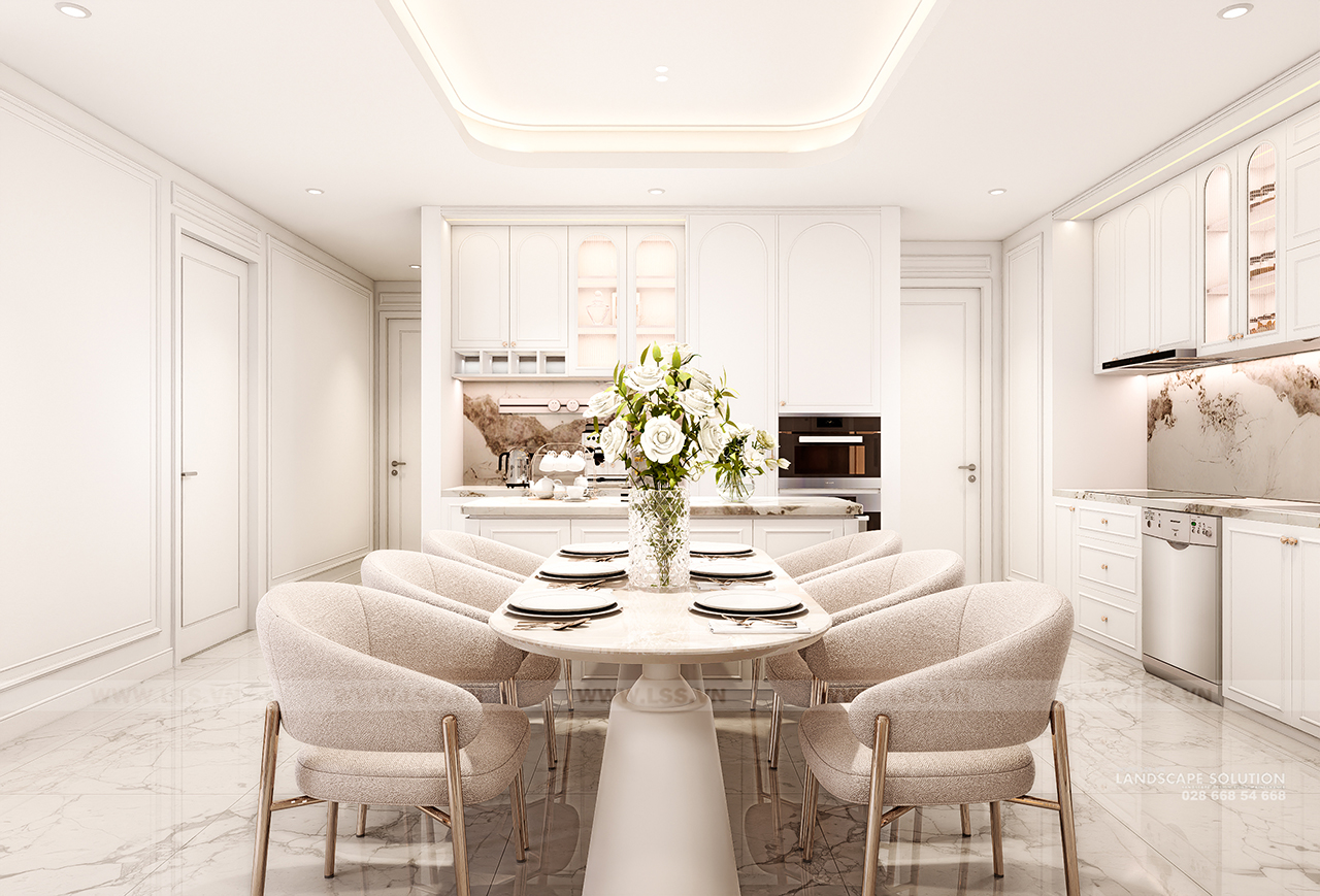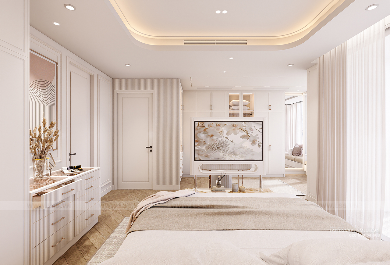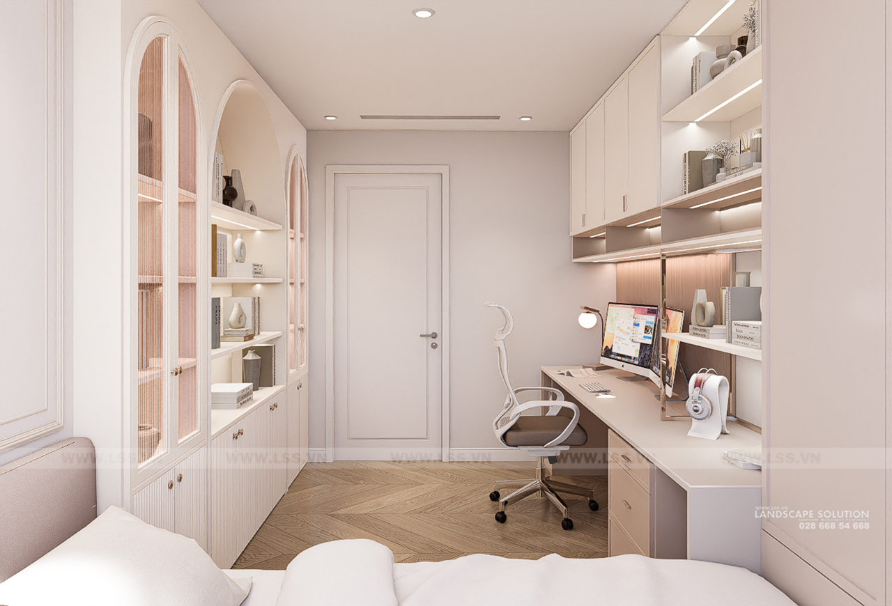 Bảng màu trung tính với tông trắng kem và be làm chủ đạo kết hợp cùng sàn gỗ xương cá ấm áp, tạo nên một phông nền hoàn hảo cho các món đồ nội thất. Mỗi chi tiết, từ những đường phào chỉ thanh mảnh trên tường, chiếc đàn piano trắng tinh khôi, đến hệ đèn chùm pha lê lộng lẫy, đều được LSS chăm chút để đạt đến sự cân bằng tuyệt đối giữa thẩm mỹ và công năng. Các vật liệu đá marble vân mây trong nhà tắm và khu vực bếp tiếp tục khẳng định sự cao cấp, trong khi những góc làm việc và kệ sách lại mang đến nét gần gũi, hiện đại.