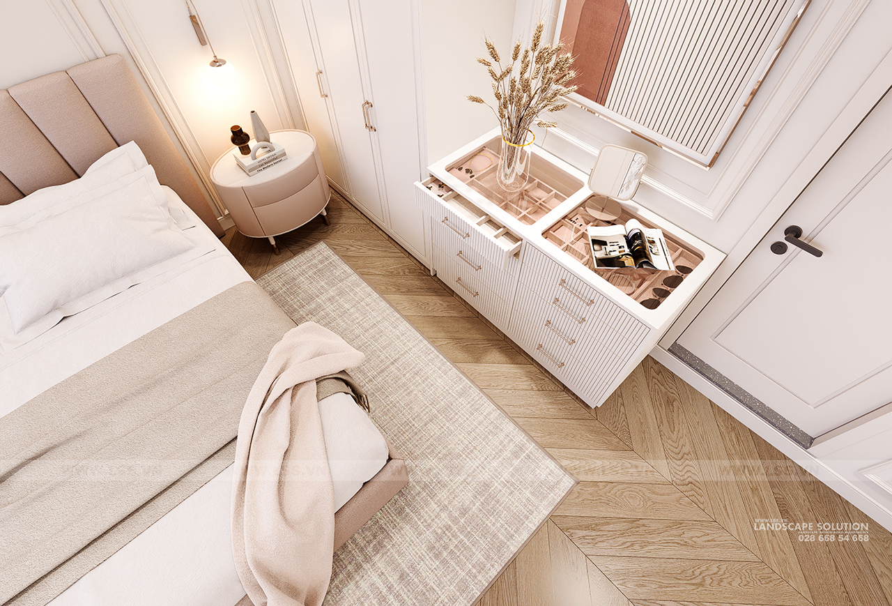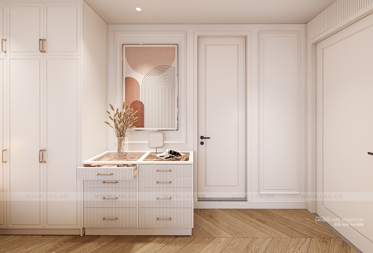 Điểm sáng lớn nhất của công trình nằm ở lối bố trí thông minh, giúp giải phóng hoàn toàn cảm giác gò bó của căn hộ chung cư. Không gian phòng khách, bếp và bàn ăn được kết nối liền mạch, tạo nên một dòng chảy ánh sáng tự nhiên xuyên suốt từ những ô cửa kính lớn. Đặc biệt, sự liên kết giữa phòng ngủ master và phòng thay đồ được tính toán tỉ mỉ, không chỉ tối ưu hóa diện tích mà còn tạo ra sự riêng tư, sang trọng như những phòng suite cao cấp tại các khách sạn 5 sao.