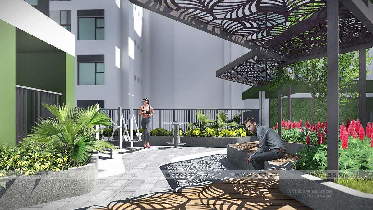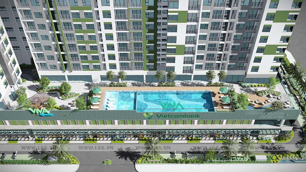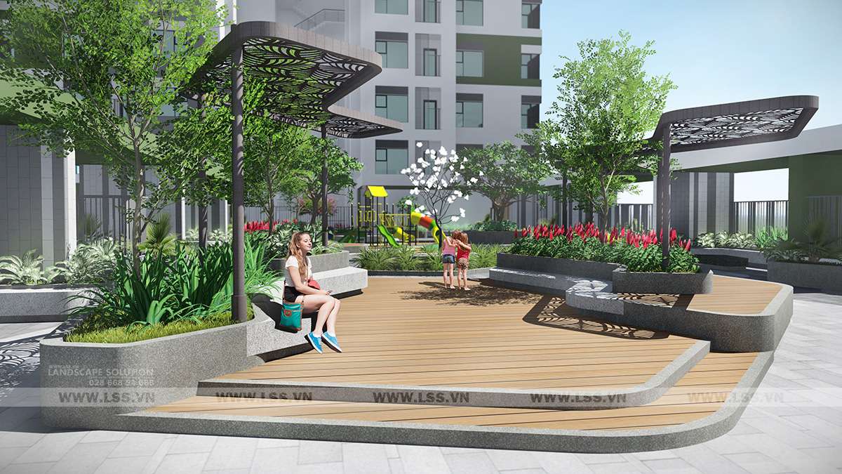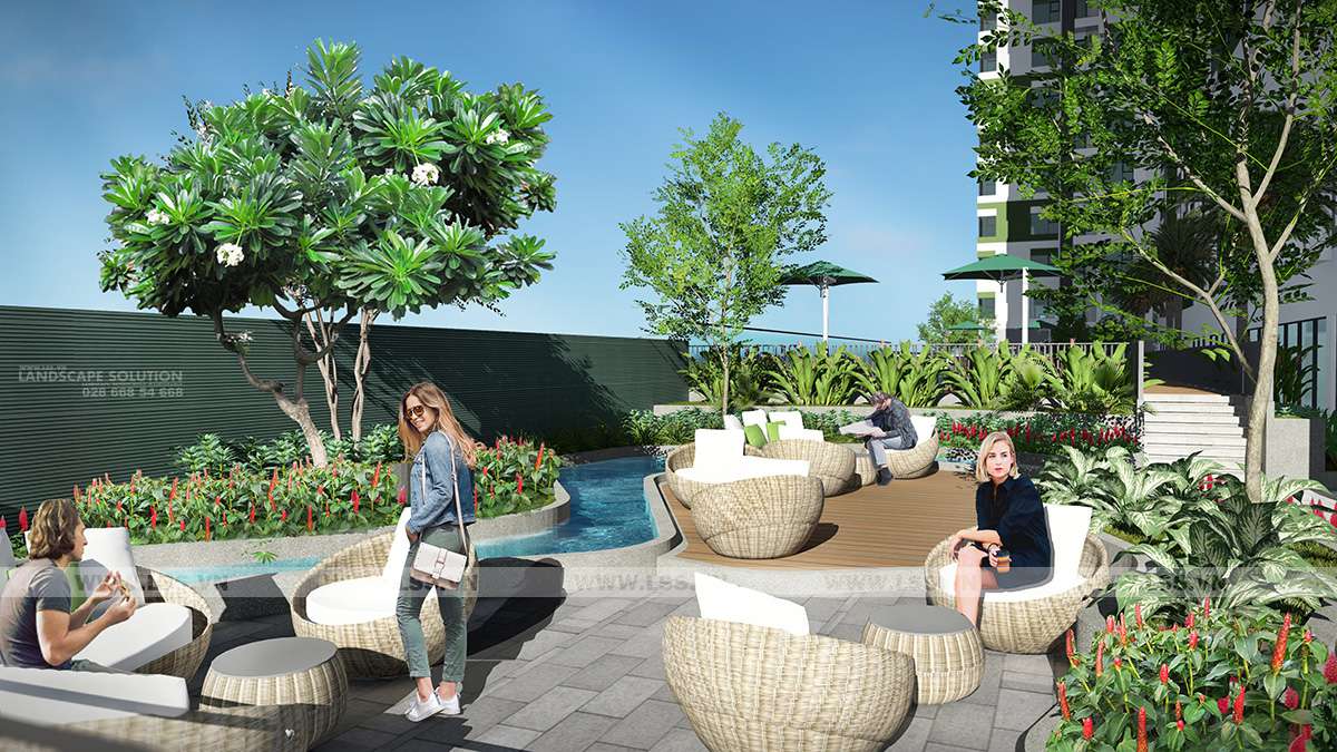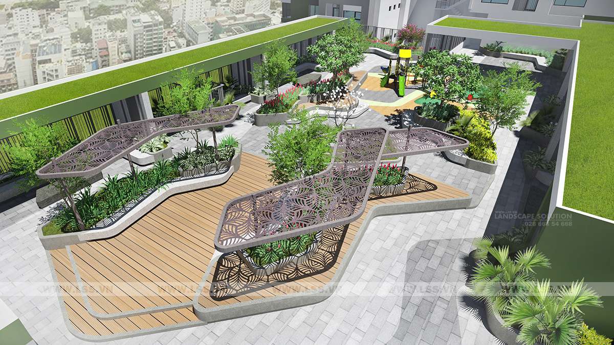 Khối căn hộ cao cấp ngoài cảnh quan dọc các tuyến đường tiếp giáp, còn đặc biệt có hệ thống cảnh quan trên mái cực kỳ độc đáo. Mang nhiệm vụ kết nối trung gian giữa khối dịch vụ bên dưới và các tầng dân cư bên trên, công viên tầng 3 được tổ chức với 2 loại hình hình chính bao gồm hồ bơi và khu café ngoài trời. Trong đó khu vực hồ bơi được thiết kế với code cao độ hơn hẳn các phần khác nhằm định hướng thay đổi không gian linh động cho người sử dụng. Đồng thời các kiến trúc sư khéo léo định hình một bồ bơi chữ nhật khá truyền thống như tương phản rõ rệt với hoa văn lát gạch theo dạng tự do, ăn khớp với đường nét của các mảng cây xanh cảnh quan khu vực café xung quanh tạo nên một tổng thể đồng điệu và hiện đại. Bồn cây kết hợp thành ghế ngồi được uốn lượn tự nhiên nhưng có chủ đích từ nhà thiết kế giúp tận dụng tối đa diện tích mà vẫn đáp ứng đủ công năng. Tầng mái trên cùng của tòa nhà là một công viên thứ hai gồm khu vườn dạo, khu đọc sách và sân chơi thiếu nhi. Cũng với sự lặp lại phong cách đường nét ở khu tầng 3 nhưng các kiến trúc LSS đã sáng tạo hơn khi sử dụng hệ thống mái che trồng cỏ và các giàn pergola với các hoa văn tinh xảo không chỉ mang lại bóng mát cần thiết cho sân thượng mà còn tạo ra các không gian mở thú vị cho người dân.