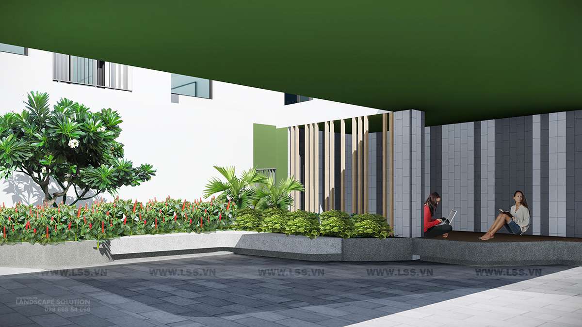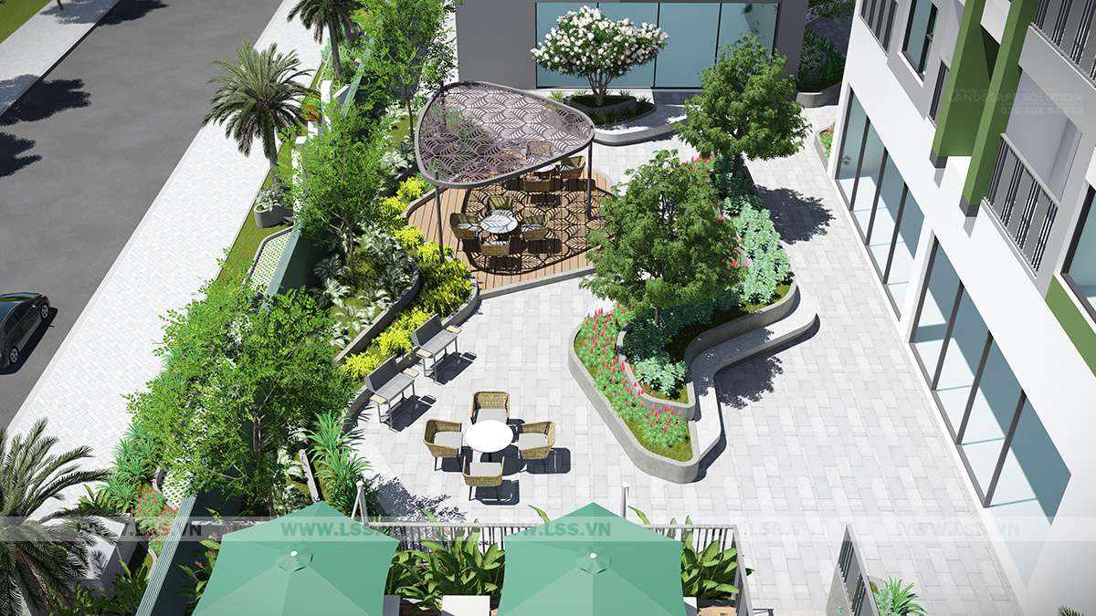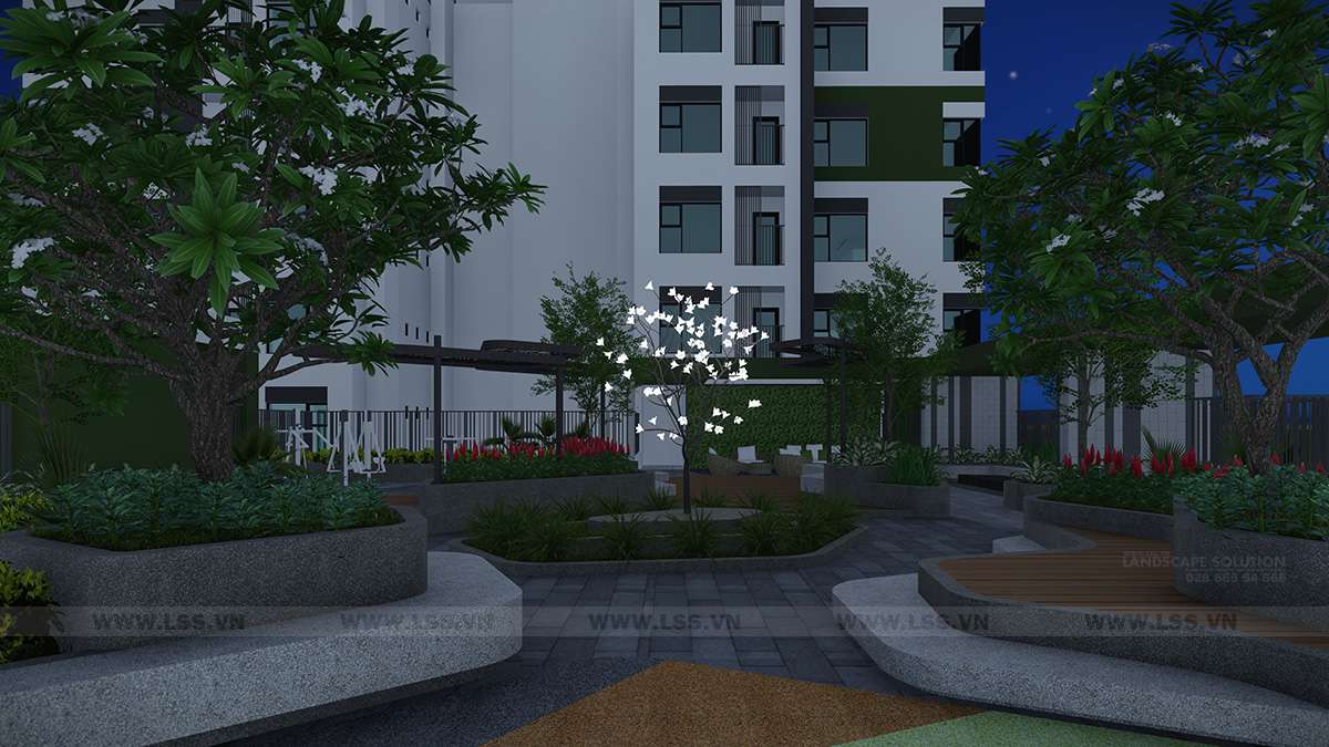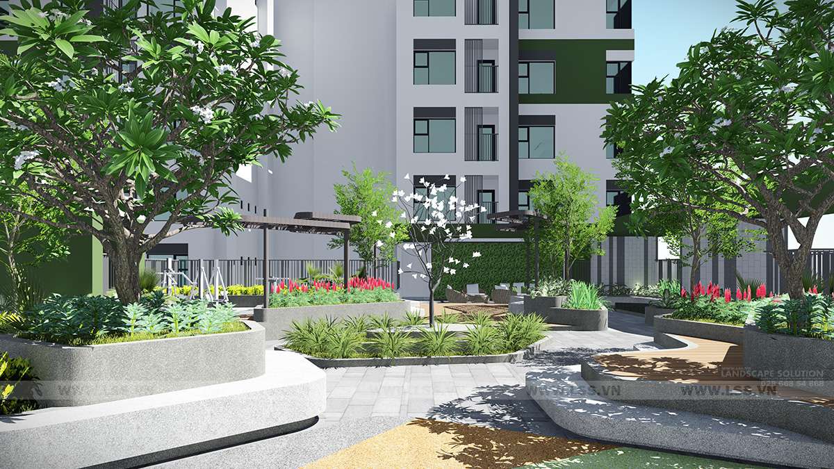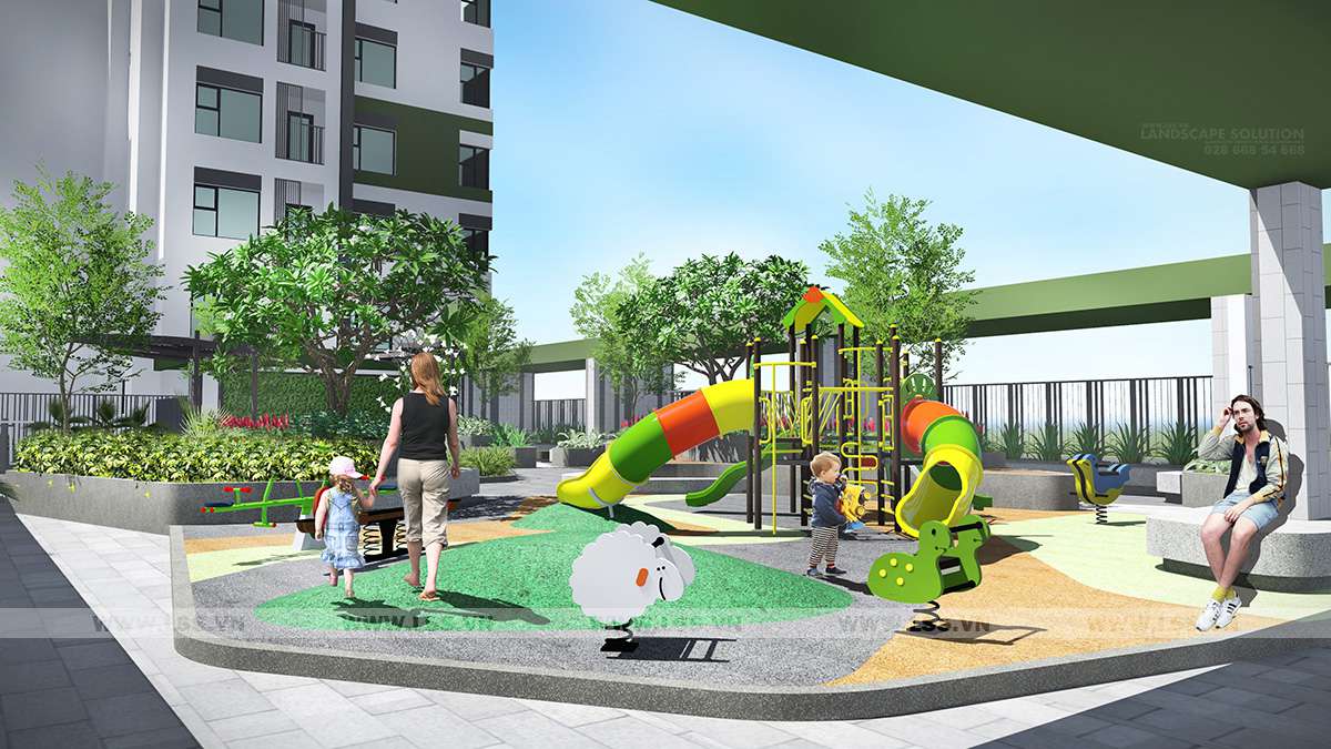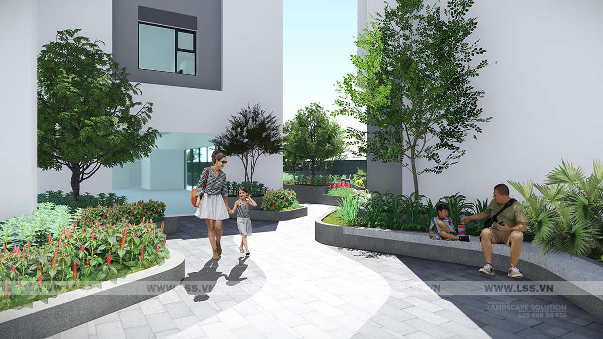 Khối căn hộ cao cấp ngoài cảnh quan dọc các tuyến đường tiếp giáp, còn đặc biệt có hệ thống cảnh quan trên mái cực kỳ độc đáo. Mang nhiệm vụ kết nối trung gian giữa khối dịch vụ bên dưới và các tầng dân cư bên trên, công viên tầng 3 được tổ chức với 2 loại hình hình chính bao gồm hồ bơi và khu café ngoài trời. Trong đó khu vực hồ bơi được thiết kế với code cao độ hơn hẳn các phần khác nhằm định hướng thay đổi không gian linh động cho người sử dụng. Đồng thời các kiến trúc sư khéo léo định hình một bồ bơi chữ nhật khá truyền thống như tương phản rõ rệt với hoa văn lát gạch theo dạng tự do, ăn khớp với đường nét của các mảng cây xanh cảnh quan khu vực café xung quanh tạo nên một tổng thể đồng điệu và hiện đại. Bồn cây kết hợp thành ghế ngồi được uốn lượn tự nhiên nhưng có chủ đích từ nhà thiết kế giúp tận dụng tối đa diện tích mà vẫn đáp ứng đủ công năng. Tầng mái trên cùng của tòa nhà là một công viên thứ hai gồm khu vườn dạo, khu đọc sách và sân chơi thiếu nhi. Cũng với sự lặp lại phong cách đường nét ở khu tầng 3 nhưng các kiến trúc LSS đã sáng tạo hơn khi sử dụng hệ thống mái che trồng cỏ và các giàn pergola với các hoa văn tinh xảo không chỉ mang lại bóng mát cần thiết cho sân thượng mà còn tạo ra các không gian mở thú vị cho người dân.