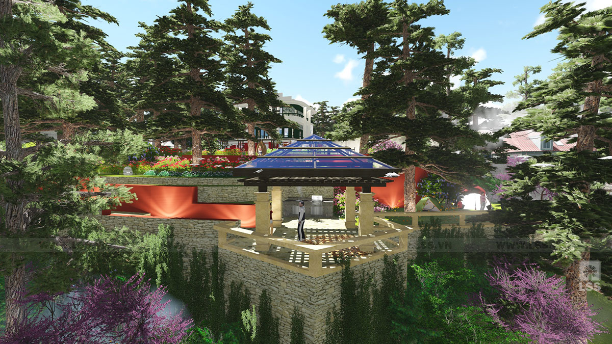 Hiểu rõ điều đó, chủ đầu tư một khu biệt thự nghỉ dưỡng rộng lớn đã tin tưởng giao LSS thiết kế toàn bộ sân vườn. Trên diện tích rộng và dốc thoai thoải, bài toán lớn nhất là tránh lặp ý tưởng và tạo hành trình thưởng ngoạn sinh động. Các kiến trúc sư đã phân chia tổng thể thành những khu vực rõ ràng: vườn hoa, quảng trường, patio ngoài trời, khu cắm trại, điểm ngắm cảnh trên cao…