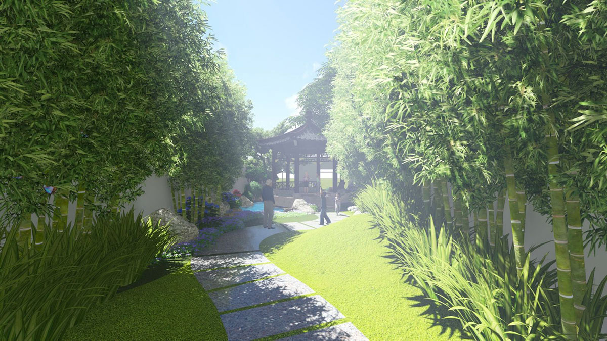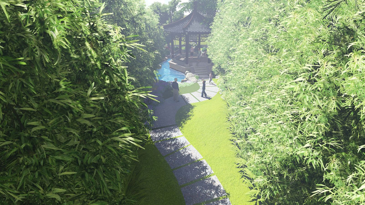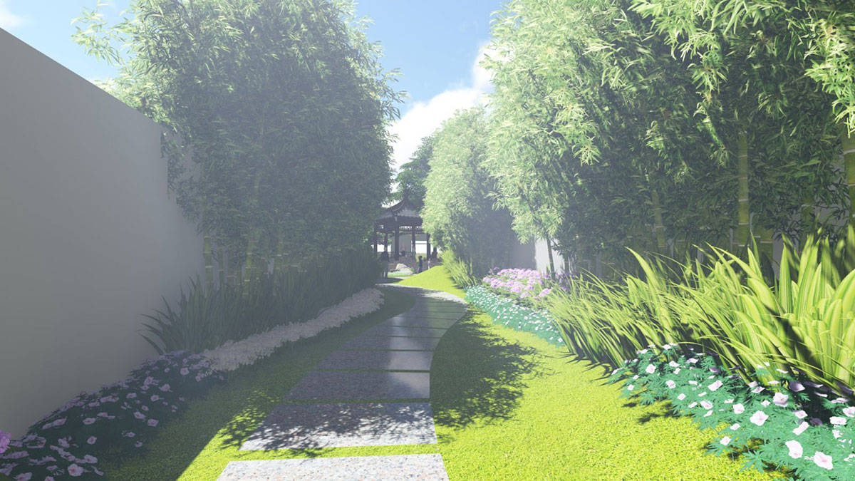 Mặt bằng rộng nhưng kéo dài đòi hỏi các kiến trúc sư sáng tạo để cảnh quan hai bên lối đi liên kết hài hòa mà không đơn điệu. Đá bước dặm uốn lượn giữa hai hàng tre – biểu tượng sân vườn Trung Hoa trở nên mềm mại hơn khi kết hợp cây bụi và cụm hoa rực rỡ. Cách bố trí tre theo nhịp “nhấn – thả” giúp không gian bớt ngộp, tạo thay đổi thị giác thú vị.