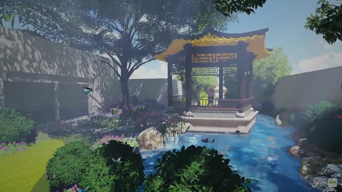 Tâm điểm của khu vườn là nhà thủy đình soi bóng bên hồ nước tự nhiên rộng lớn, cùng cây lớn tỏa bóng mát. Kết cấu mái lục giác mang ý nghĩa “lộc”, hệ hoa gió truyền thống, lan can và cột đỡ bằng gỗ đá đều được nghiên cứu kỹ lưỡng để truyền tải tinh hoa kiến trúc Trung Hoa. Yếu tố âm dương – nền tảng của sân vườn Trung Hoa được thể hiện rõ qua sự kết hợp của nước (âm) và đá (dương): hồ nước và thác suối róc rách mang nguồn năng lượng nuôi dưỡng cả không gian; đá được đặt ngẫu nhiên nhưng có chủ đích, dẫn dắt tầm nhìn và kết nối cảnh quan.