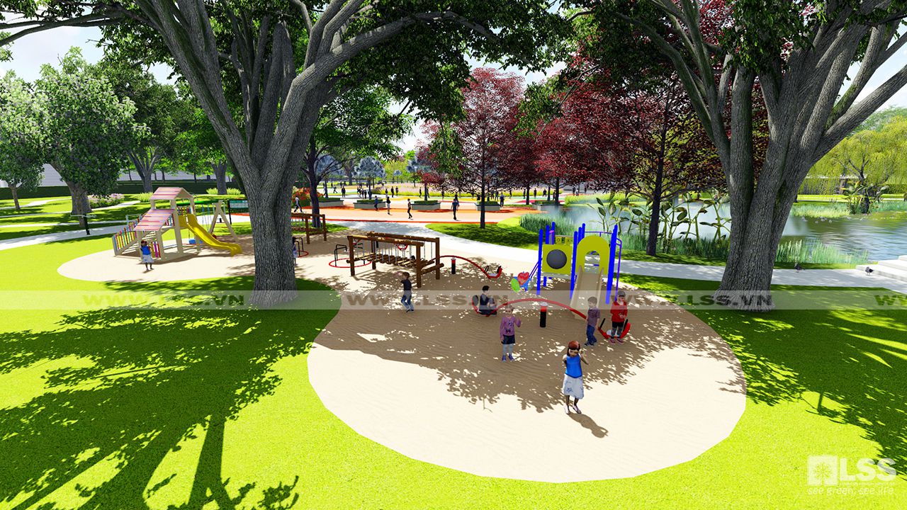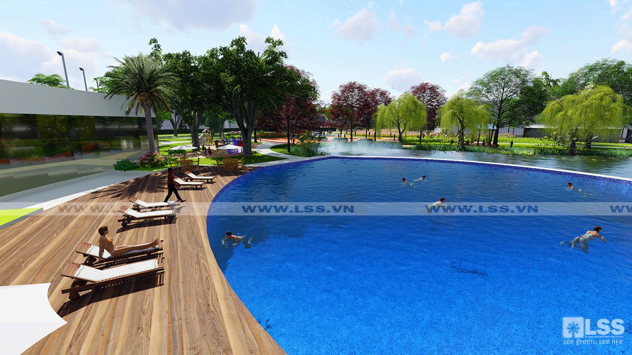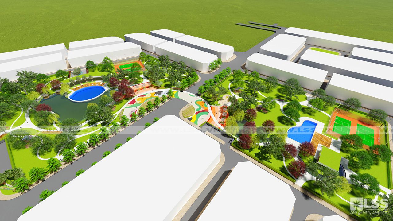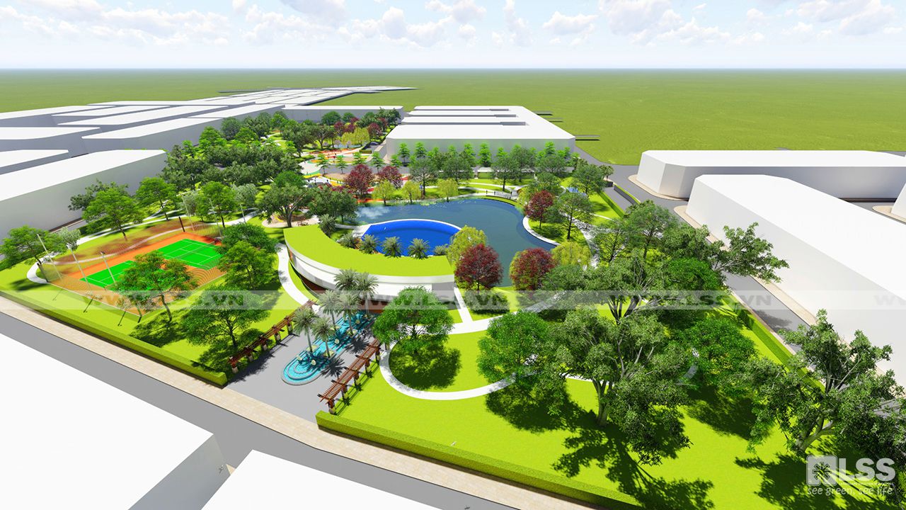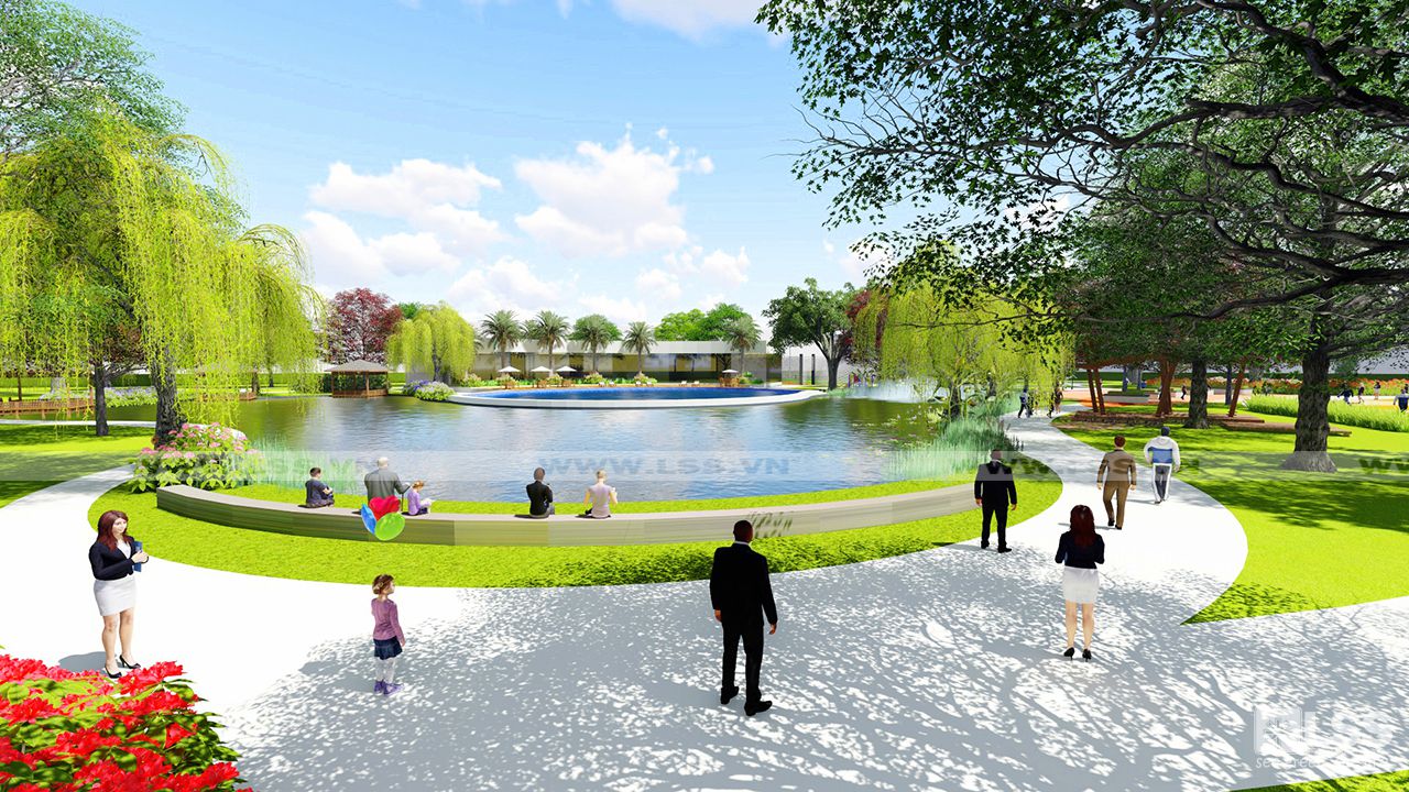 Bố cục công viên bao gồm 2 mảng xanh đối diện qua trục cảnh quan chính, mỗi mảng xanh đảm bảo đầy đủ các yếu tố tiện ích đáp ứng cho dân cư của các khối nhà liền kề như sân thể thao, quảng trường, vườn dạo, khu dịch vụ ăn uống, và các cảnh quan mặt nước kèm theo. Quảng trường của hai công viên đươc các kiến trúc sư kết nối một cách khéo léo qua đường nét và màu sắc, đặc biệt là nét chấm phá vật liệu ngay trên mặt đường lộ giúp tăng tính tương tác đồng thời trơ thành điểm nhấn thu hút mọi người khi đến với dự án. Trên một diện tích 3.7 ha thì việc tạo những hồ cảnh quan chắc chắn là điều không thể thiếu. Dọc theo hồ cảnh quan các kiến trúc sư bố trí nhiều cây trồng đa dạng, đặc biệt là liễu và các cây thủy sinh tạo nên hình ảnh quyến rũ và lãng mạn cho khu vực. Bên cạnh đó các yếu tố khác như vọng lâu, chòi nghỉ hay các biểu tượng trong công viên cũng được LSS thiết kế với các đường nét hiện đại tạo nên một tổng thể các góc nhìn vô cùng độc đáo và mới lạ. Nhưng đặc biệt hơn cả là một trong hai bể bơi của khu dân cư lại nằm gọn trong hồ cảnh quan của dự án, tạo cảm giác như bạn có thể đắm chìm trong 1 không gian hoàn toàn tự nhiên và sinh thái đã góp phần tạo nên một tổng thể công viên đặc sắc và trên hết là đáp ứng đầy đủ các nhu cầu tiện tích cho dân cư trong khu vực.