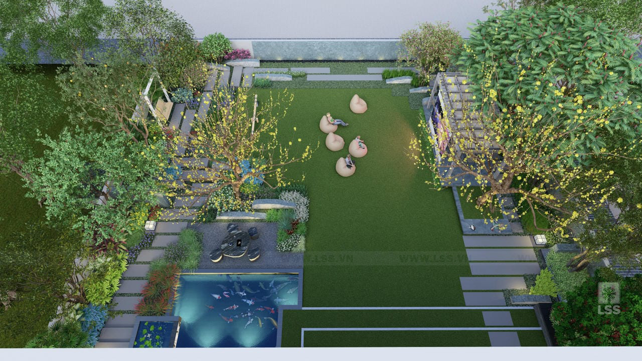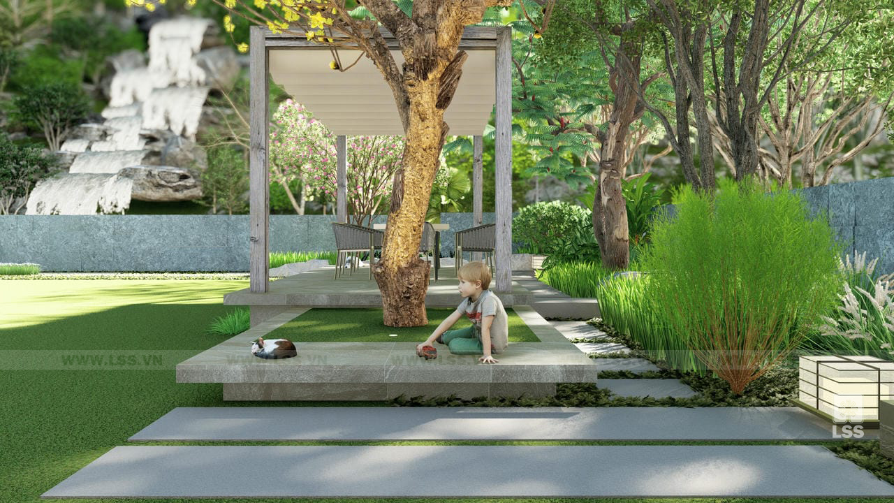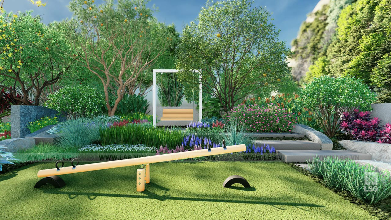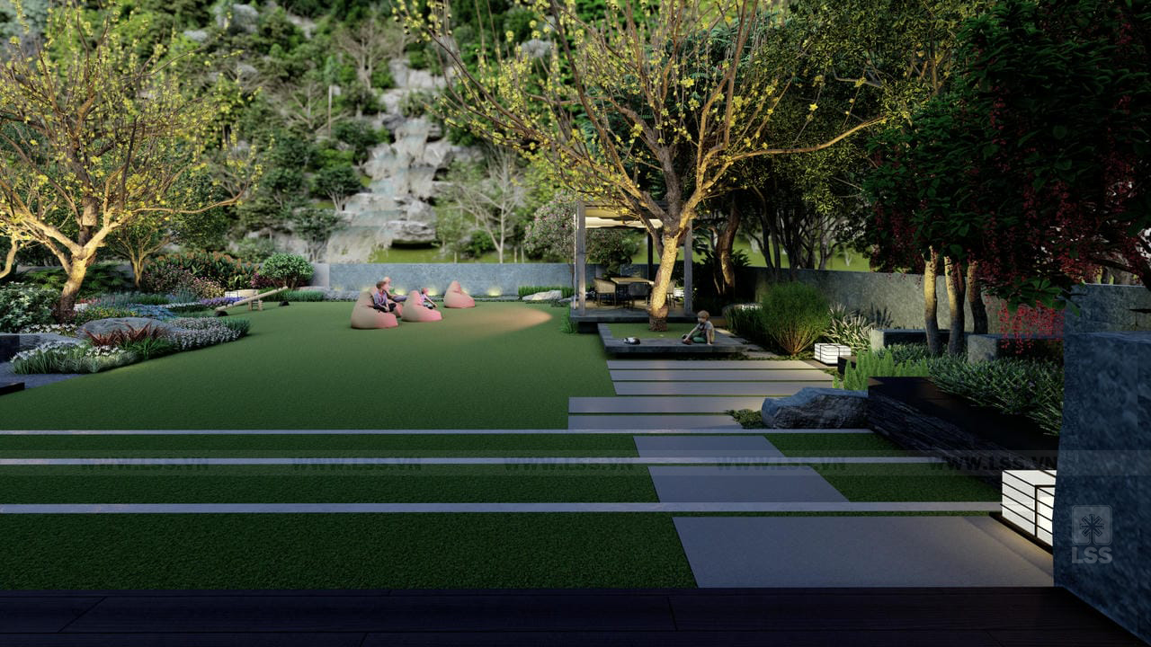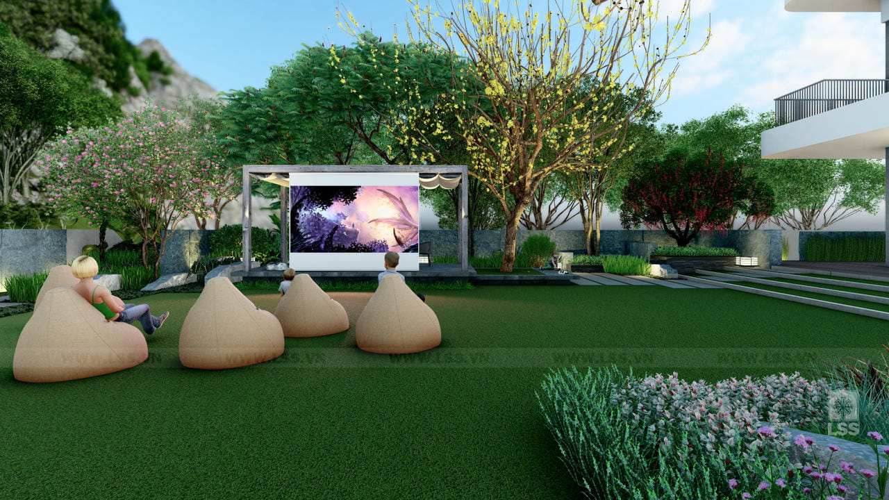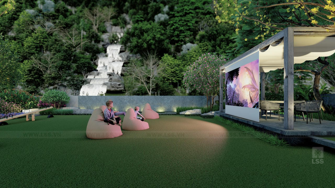 Bên cạnh đó, các tiện ích ngoài trời như sân cỏ đa năng, chòi nghỉ, khu vực chiếu phim ngoài trời và khu vui chơi trẻ em với xích đu, bập bênh được bố trí tinh tế, mang đến những trải nghiệm giải trí phong phú ngay tại tổ ấm. Những chi tiết trang trí từ tường đá nghệ thuật đến các khu vực check-in gia đình không chỉ nâng tầm thẩm mỹ mà còn tạo nên chiều sâu cảm xúc cho không gian. Qua dự án Green House, LSS không chỉ mang đến một bản thiết kế cảnh quan mà còn trao gửi một phong cách sống xanh, nơi mỗi thành viên có thể tìm thấy sự cân bằng và tái tạo năng lượng mỗi ngày.
