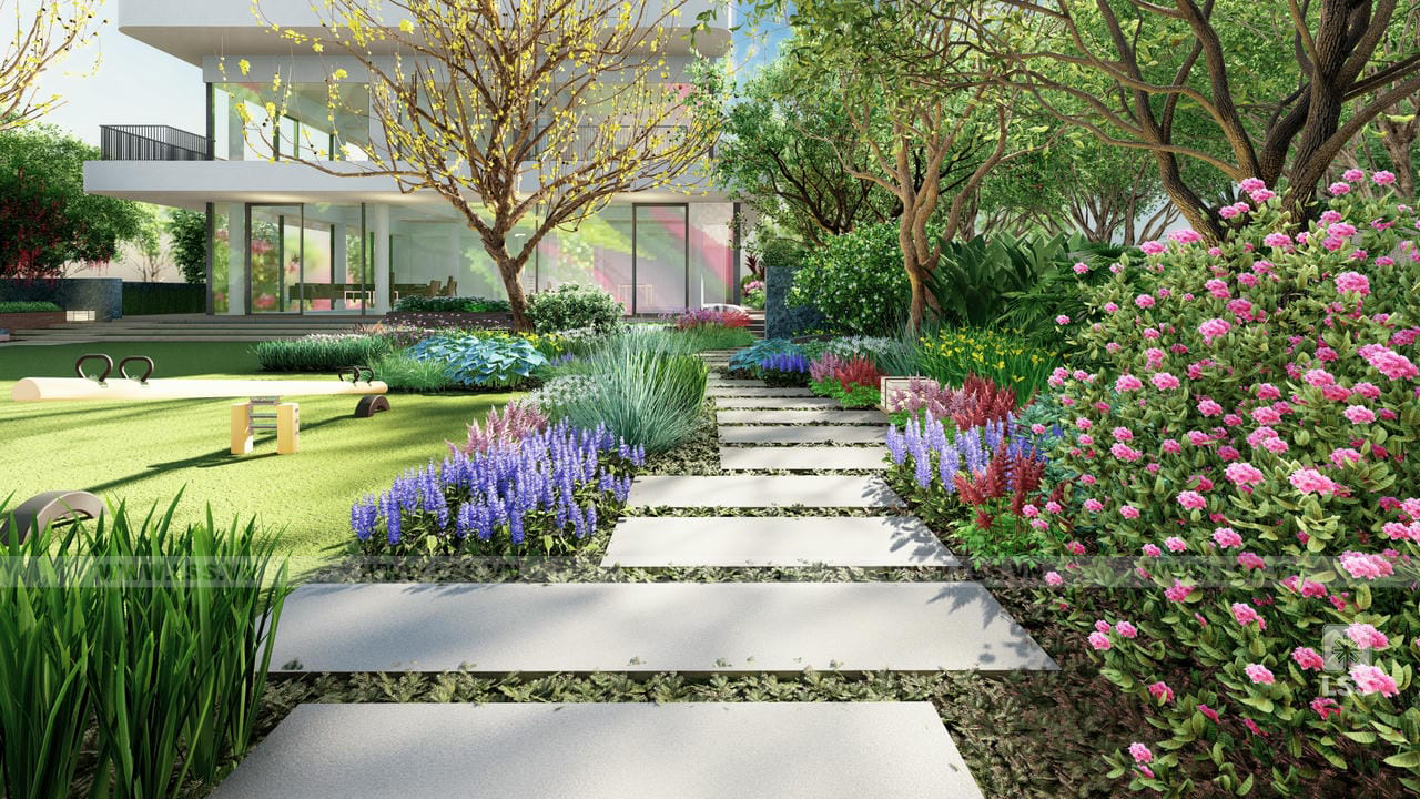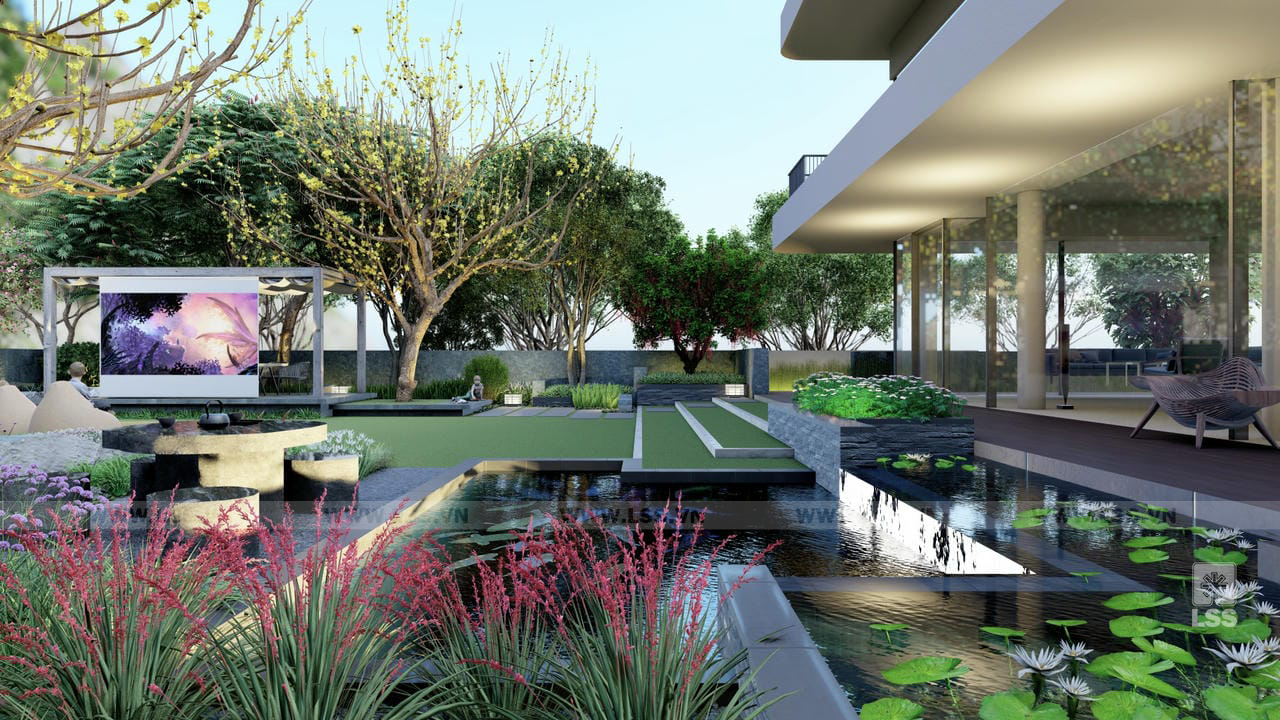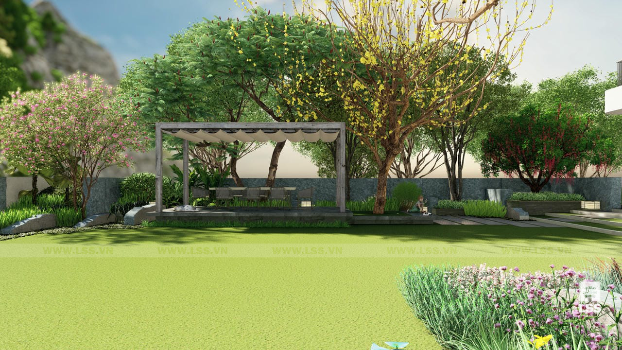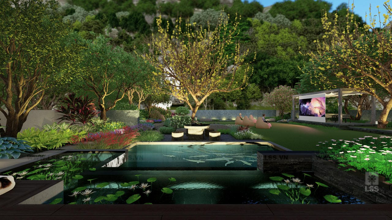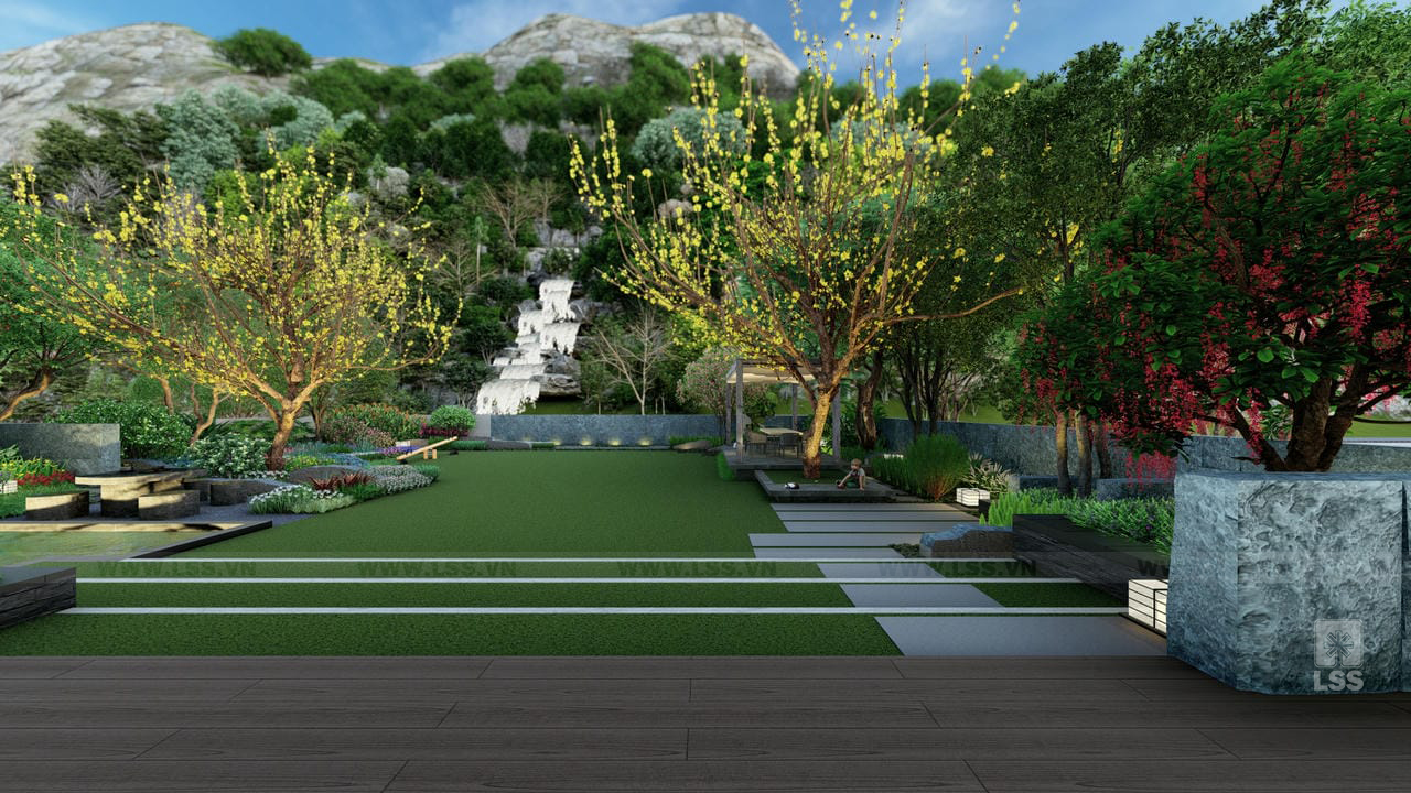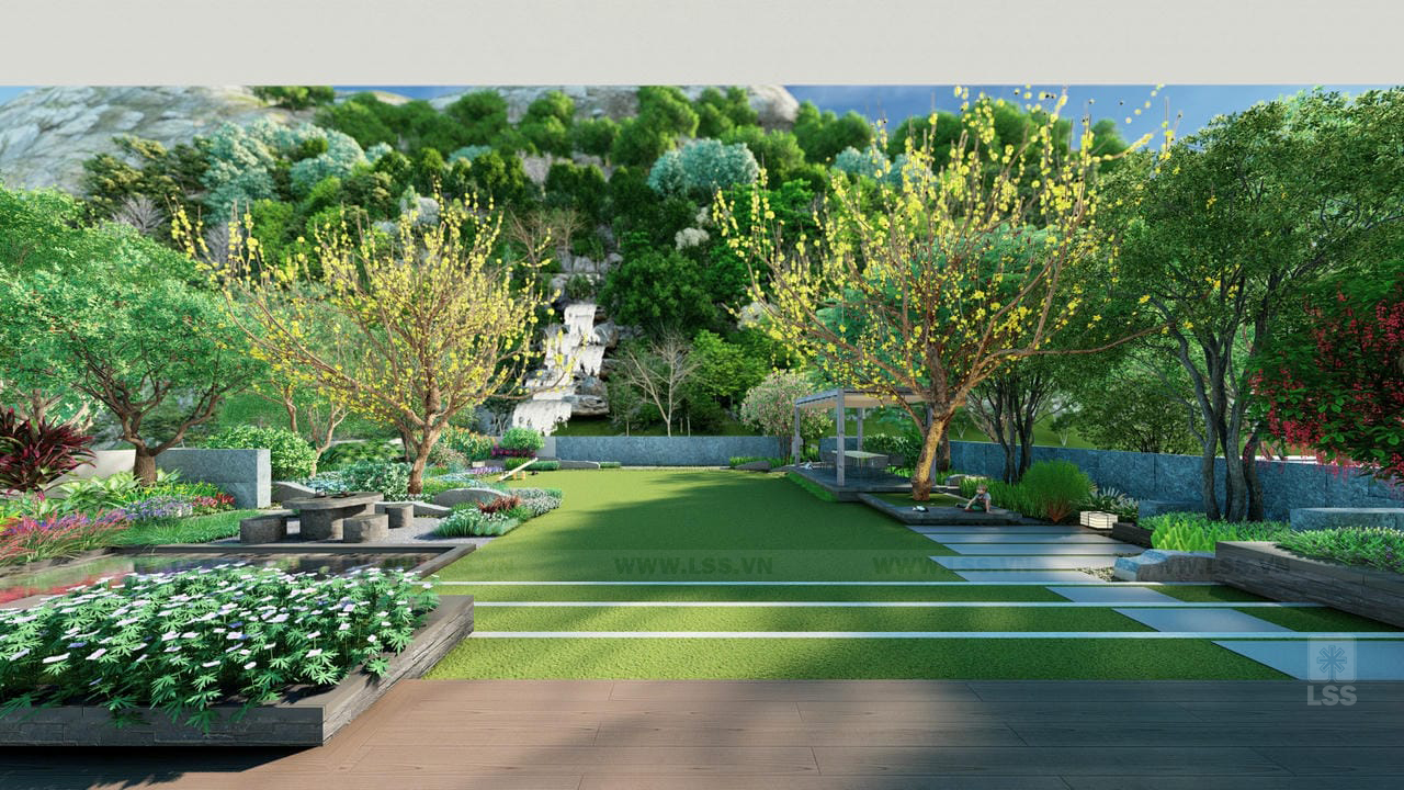 Bên cạnh đó, các tiện ích ngoài trời như sân cỏ đa năng, chòi nghỉ, khu vực chiếu phim ngoài trời và khu vui chơi trẻ em với xích đu, bập bênh được bố trí tinh tế, mang đến những trải nghiệm giải trí phong phú ngay tại tổ ấm. Những chi tiết trang trí từ tường đá nghệ thuật đến các khu vực check-in gia đình không chỉ nâng tầm thẩm mỹ mà còn tạo nên chiều sâu cảm xúc cho không gian. Qua dự án Green House, LSS không chỉ mang đến một bản thiết kế cảnh quan mà còn trao gửi một phong cách sống xanh, nơi mỗi thành viên có thể tìm thấy sự cân bằng và tái tạo năng lượng mỗi ngày.