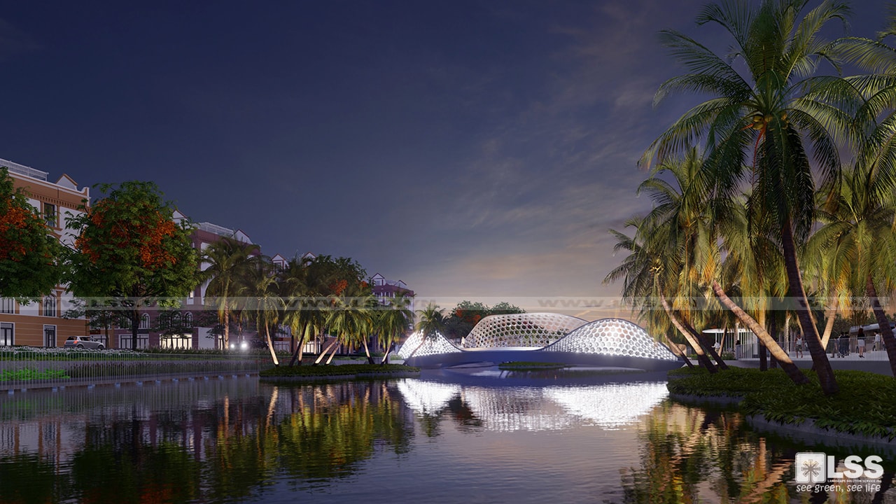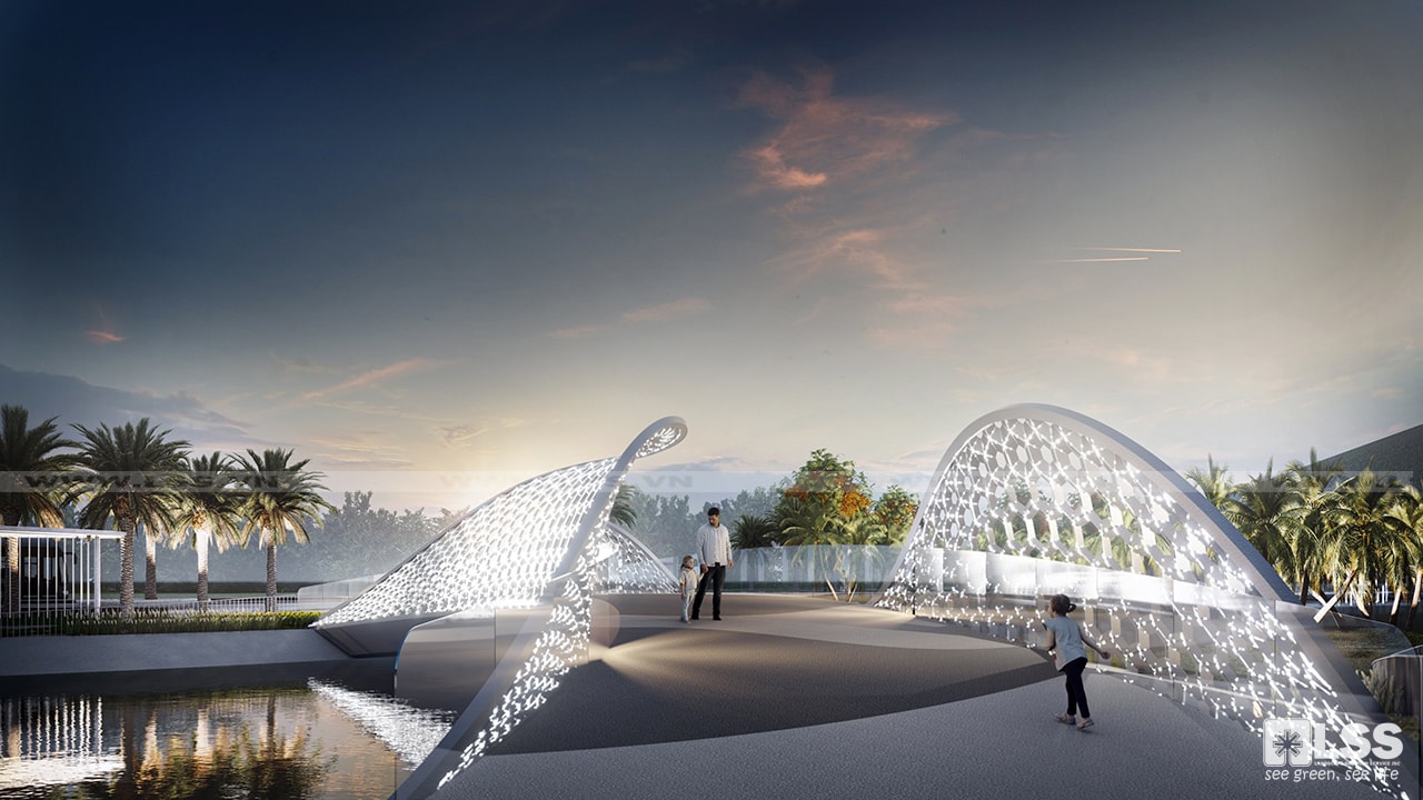 Ý tưởng định hình không gian là sự phối hợp hài hòa giữa các điểm cảnh quan phân bố rải rác, các cụm và mảng cảnh quan diện tích lớn làm nơi tụ tập dừng chân của cư dân như: cầu đi bộ, đảo cá, sân TDTT ngoài trời, khu vui chơi, cầu nối đập tràn, sàn ngắm cảnh,… Trong đó không thể không kể đến các điểm nhấn đặc trưng như hệ thống vòi phun tạo hình ấn tượng, những chiếc đèn cá tỏa sáng trên đồng cỏ hay cây cầu đi bộ uyển chuyển với vẻ ngoài kiêu kỳ lung linh khi đêm xuống.