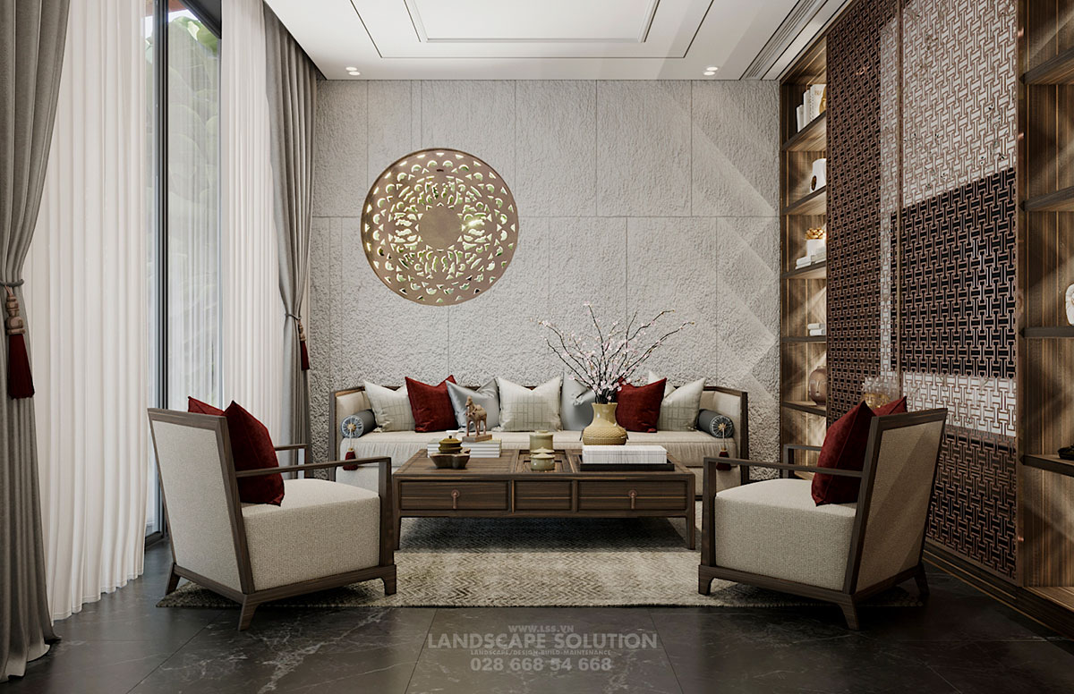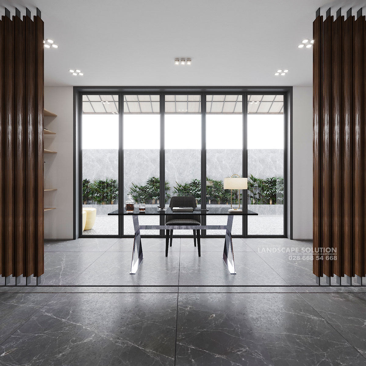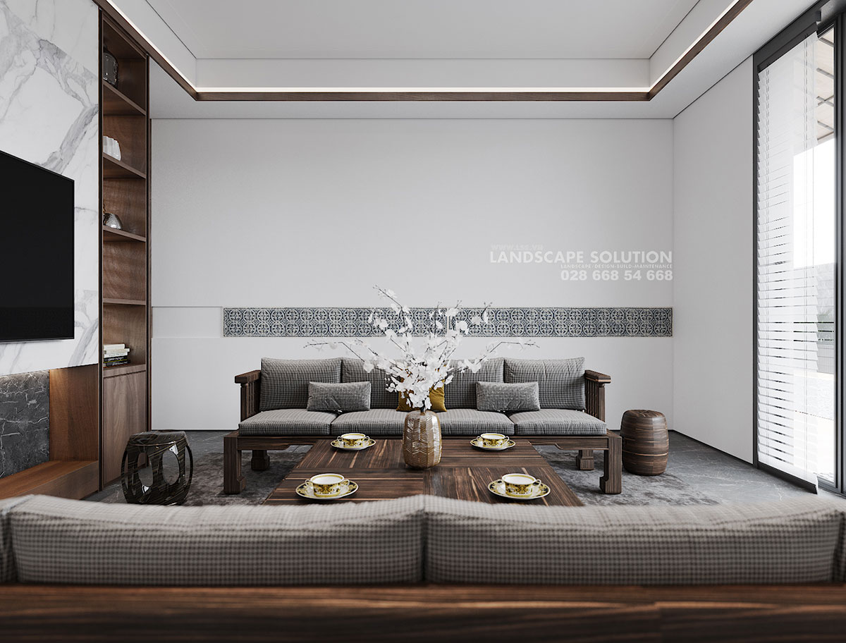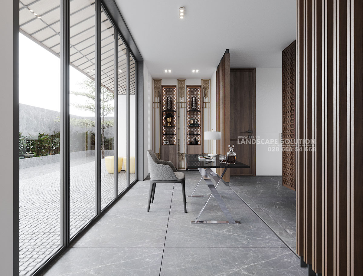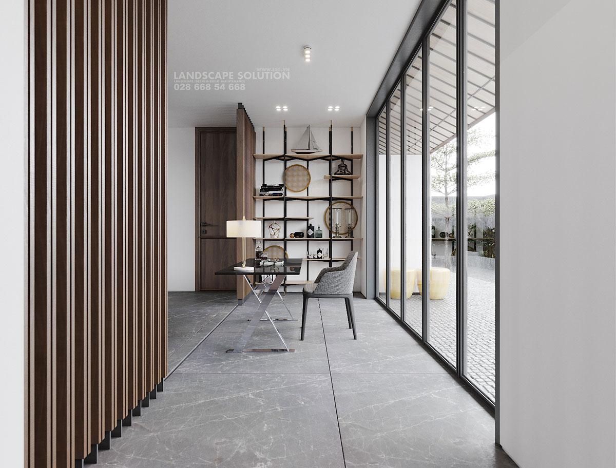 Bước vào bên trong, nội thất gây ấn tượng với tông màu trung tính chủ đạo, kết hợp vật liệu gỗ tự nhiên và đá mộc mạc. Hệ cửa kính lớn giúp ánh sáng tràn ngập, mở rộng không gian và kết nối trực tiếp với cảnh quan bên ngoài. Phòng khách, phòng đọc, phòng ăn được bố trí liên hoàn nhưng phân tách khéo léo bằng lam gỗ và mảng tường, vừa thông thoáng vừa ấm cúng.