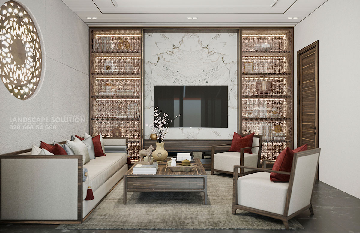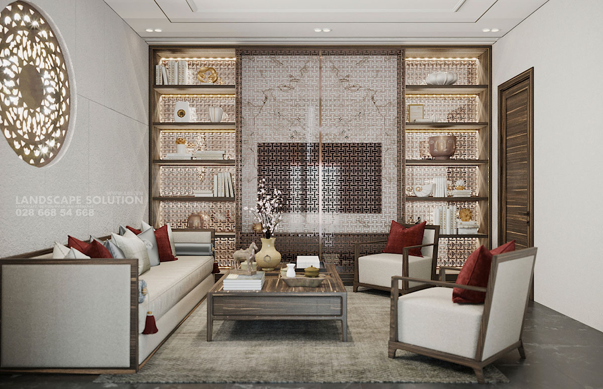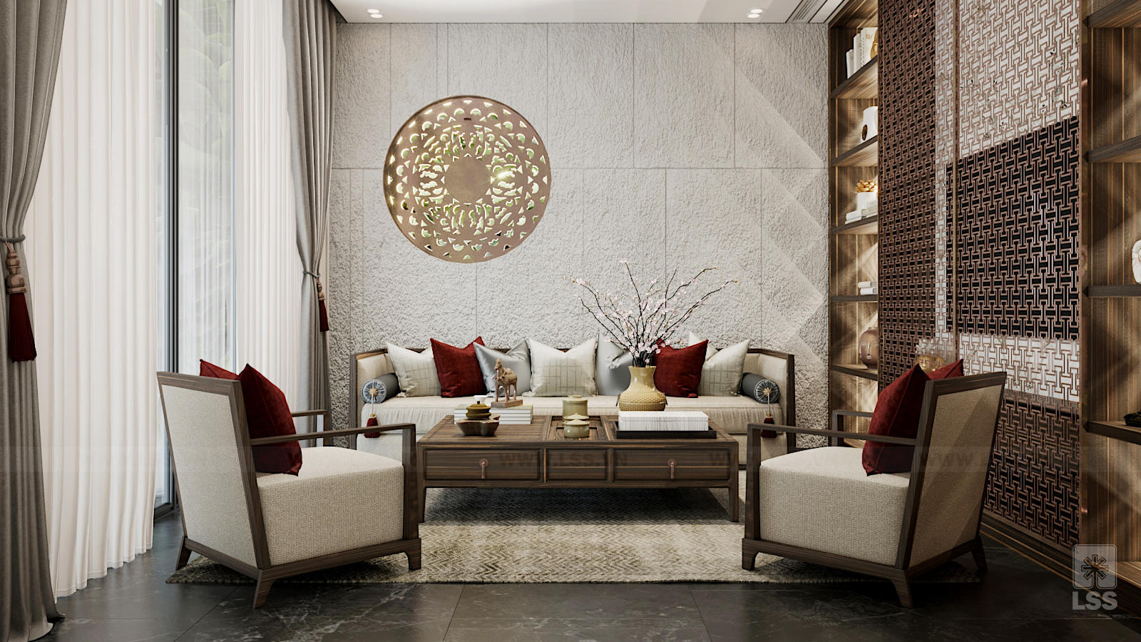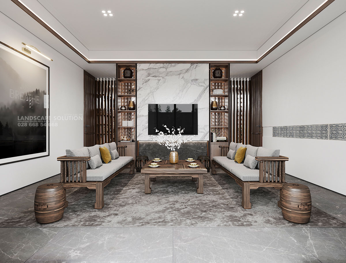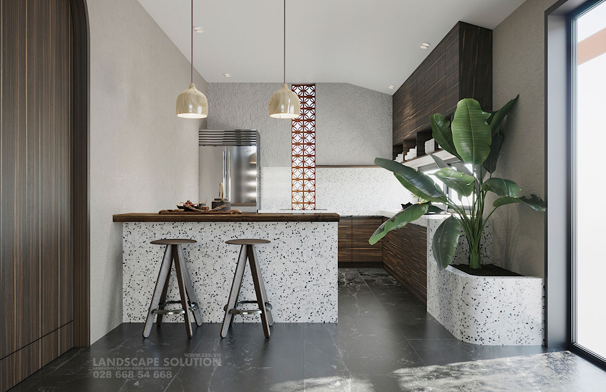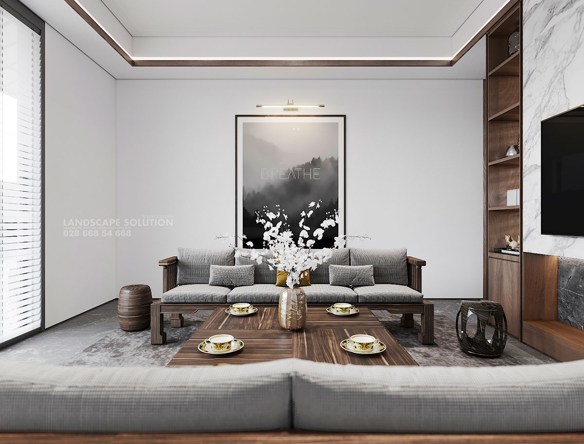 Bước vào bên trong, nội thất gây ấn tượng với tông màu trung tính chủ đạo, kết hợp vật liệu gỗ tự nhiên và đá mộc mạc. Hệ cửa kính lớn giúp ánh sáng tràn ngập, mở rộng không gian và kết nối trực tiếp với cảnh quan bên ngoài. Phòng khách, phòng đọc, phòng ăn được bố trí liên hoàn nhưng phân tách khéo léo bằng lam gỗ và mảng tường, vừa thông thoáng vừa ấm cúng.
