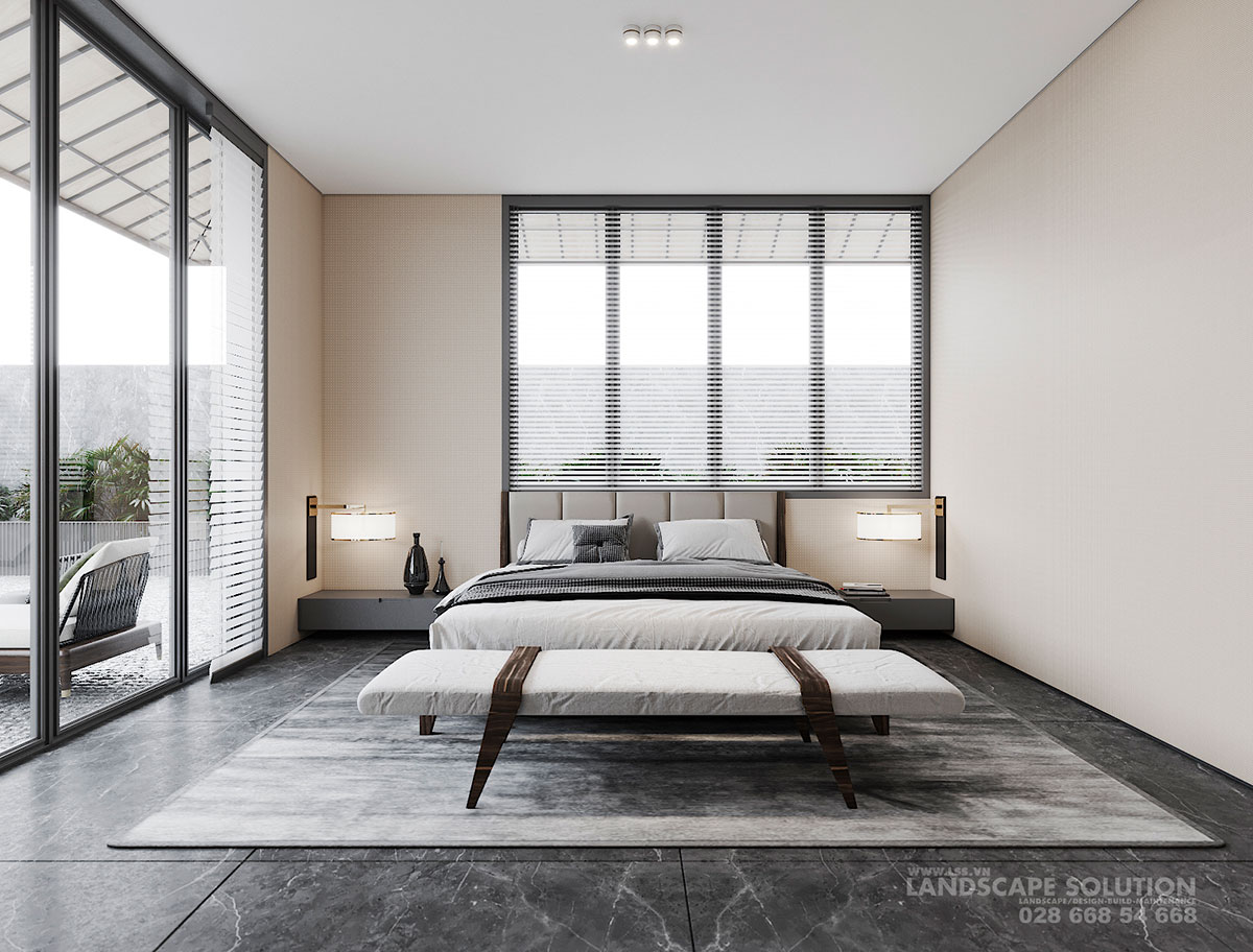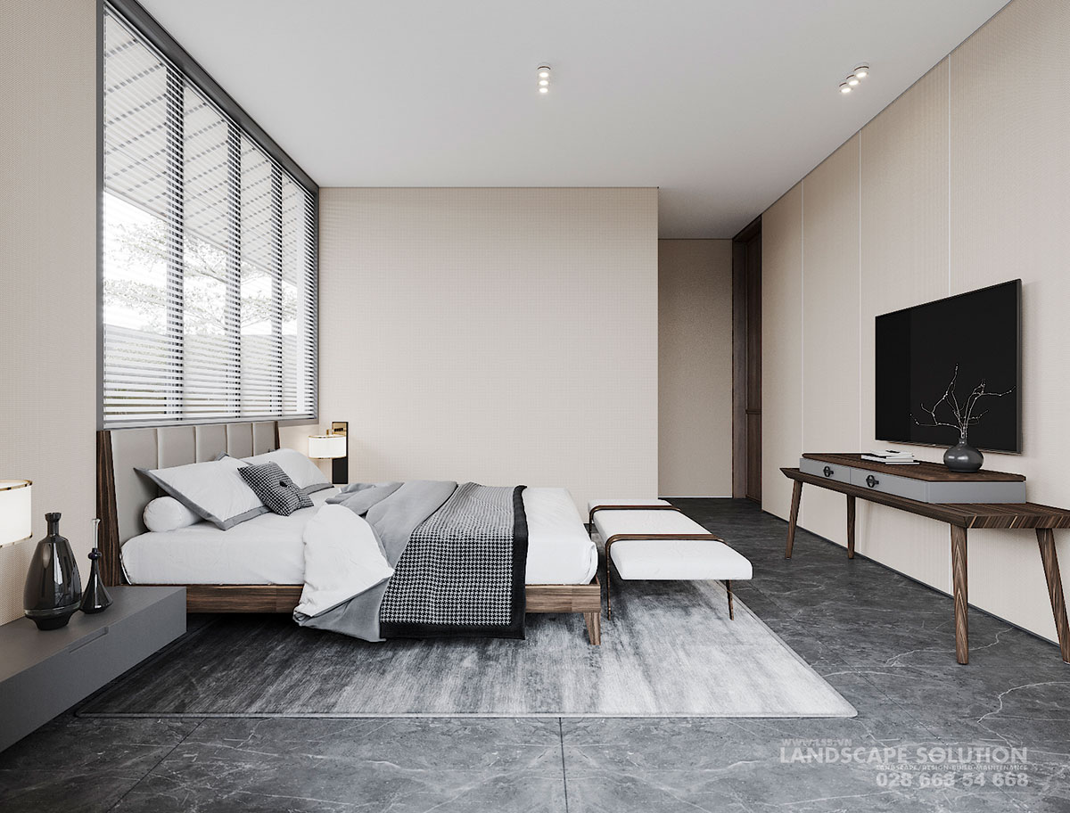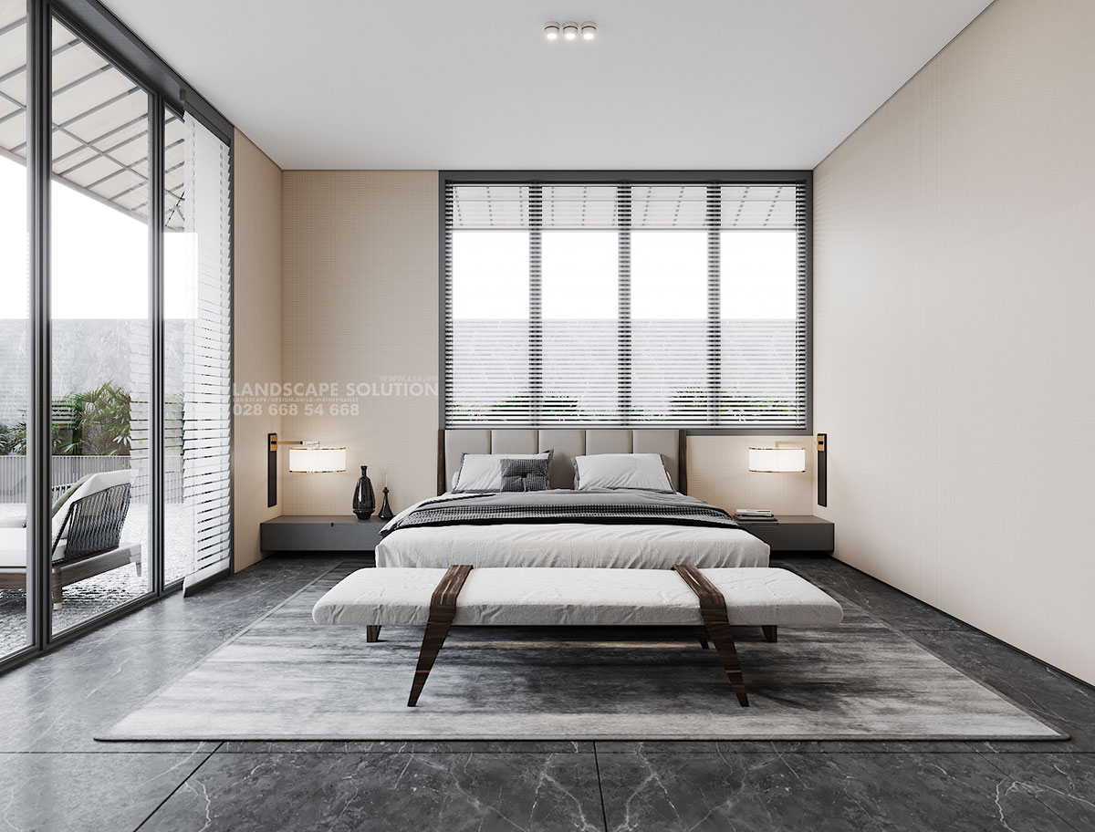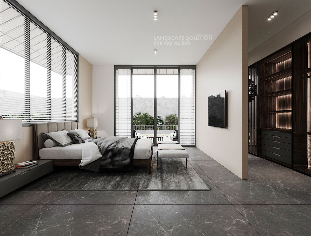Phòng ngủ giữ trọn sự tối giản, gọn gàng và thoáng đãng, nơi mỗi buổi sáng có thể đón trọn ánh nắng và tầm nhìn xanh mát. Phòng tắm hiện đại, tinh tế với gam màu đá tự nhiên, tạo cảm giác thư giãn như đang ở resort.