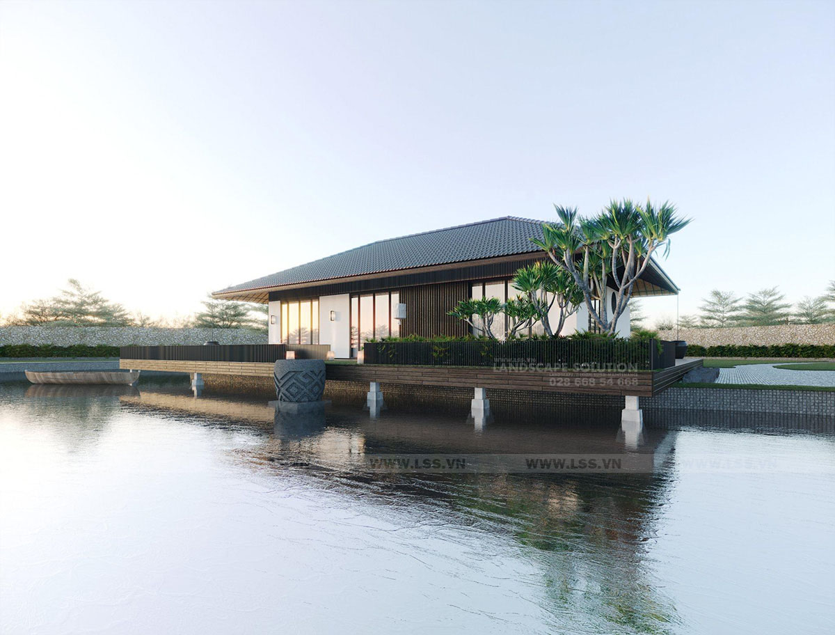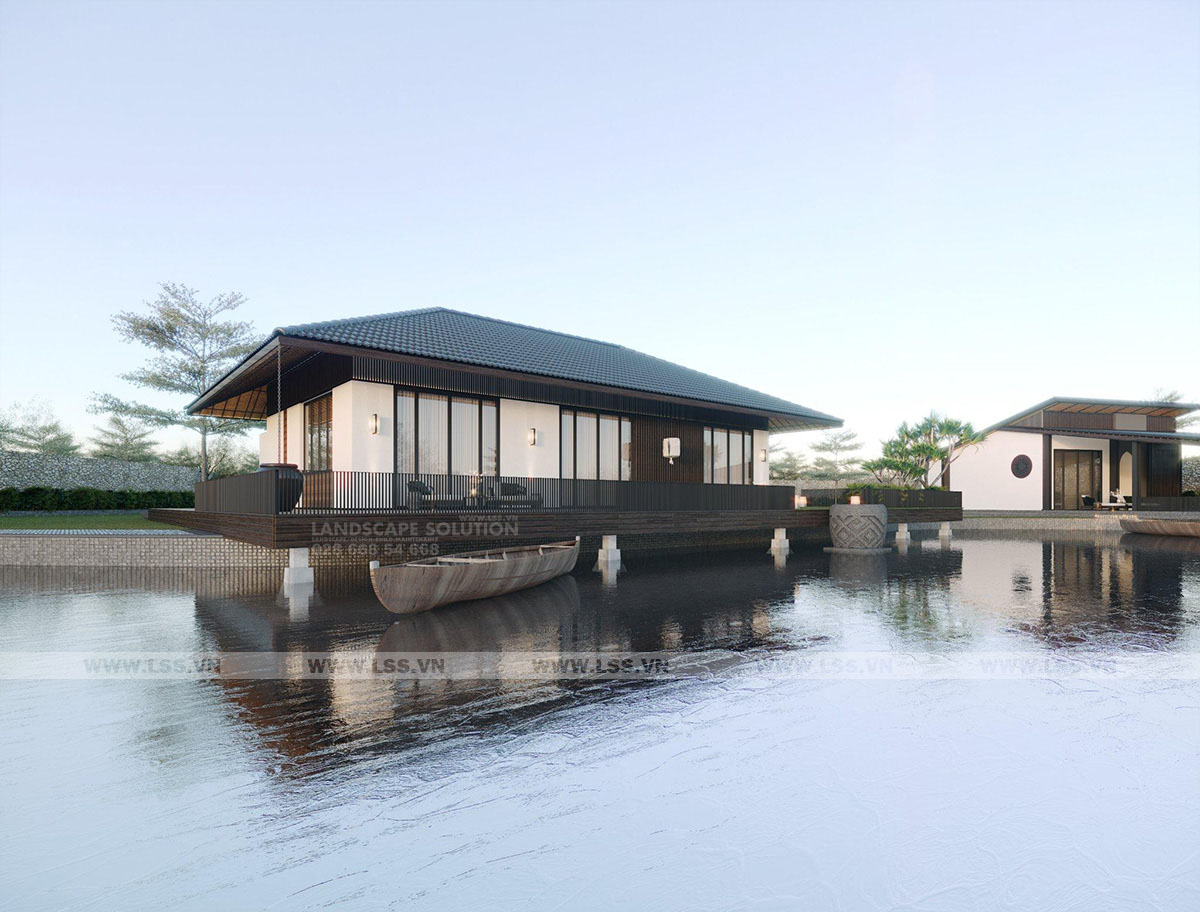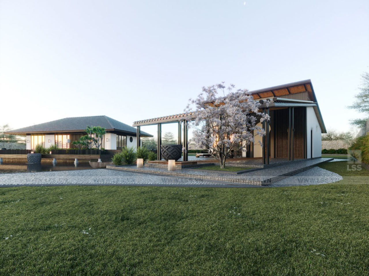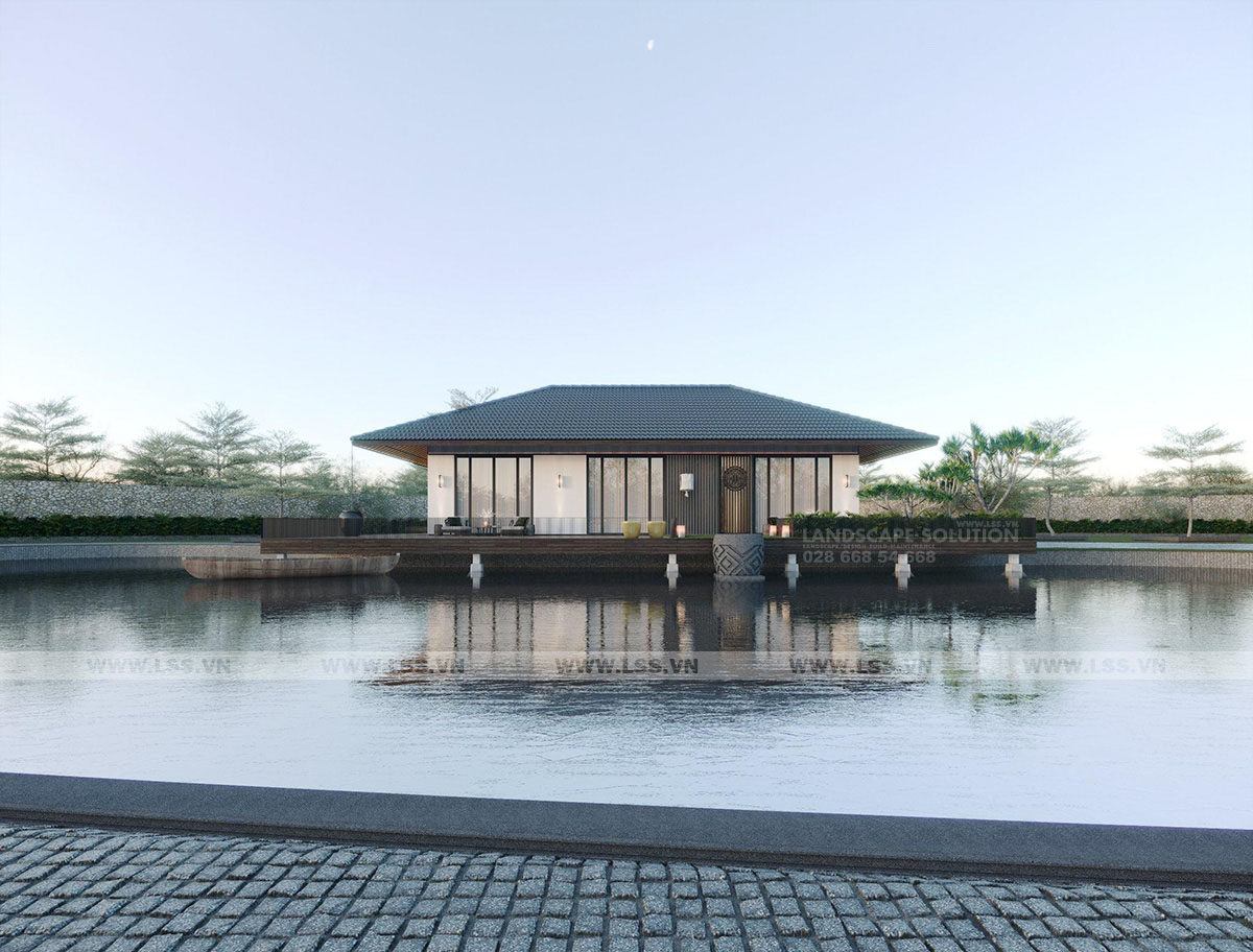 Tổng thể kiến trúc được phát triển trên ý tưởng nhà vườn truyền thống, mái dốc nhẹ phủ ngói tối giản, mở rộng tối đa về phía mặt nước để tận dụng tầm nhìn và gió trời. Không gian như trải dài theo hồ, phản chiếu bóng nhà và cây xanh, tạo cảm giác an nhiên, gần gũi nhưng cũng đầy ấn tượng.