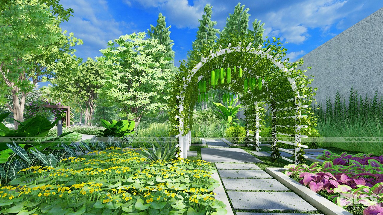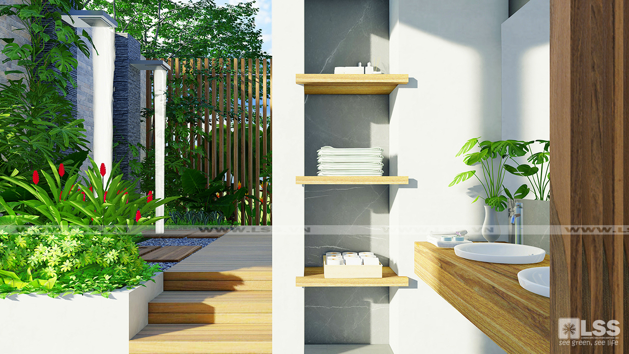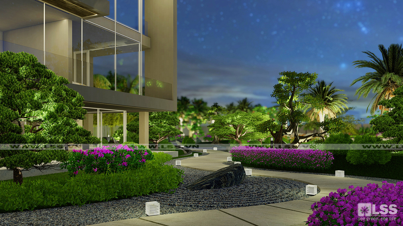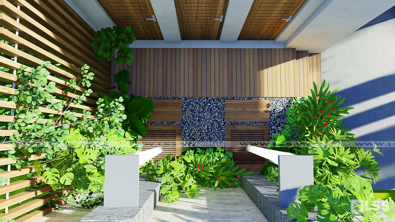 Sự sáng tạo và phá cách của phương án nằm ở khu vực chòi nghỉ của hồ cá Koi. Thành bể làm từ kính cường lực, khu vực sinh hoạt được thiết kế thấp hơn mực nước hồ Koi tạo nên một không gian như hòa vào lòng nước – nơi mà bạn có thể ngắm nhìn đàn cá tung tăng cực kỳ lạ mắt. Giàn mái che từ gỗ nhân tạo với tạo hình và kết cấu hiện đại cũng là điểm nhấn độc đáo nổi bật giữa tổng thể sân vườn, đặc biệt khi màn đêm xuống, hệ thống đèn chiếu sáng lại làm cho khu vực thêm lung linh và huyền diệu.