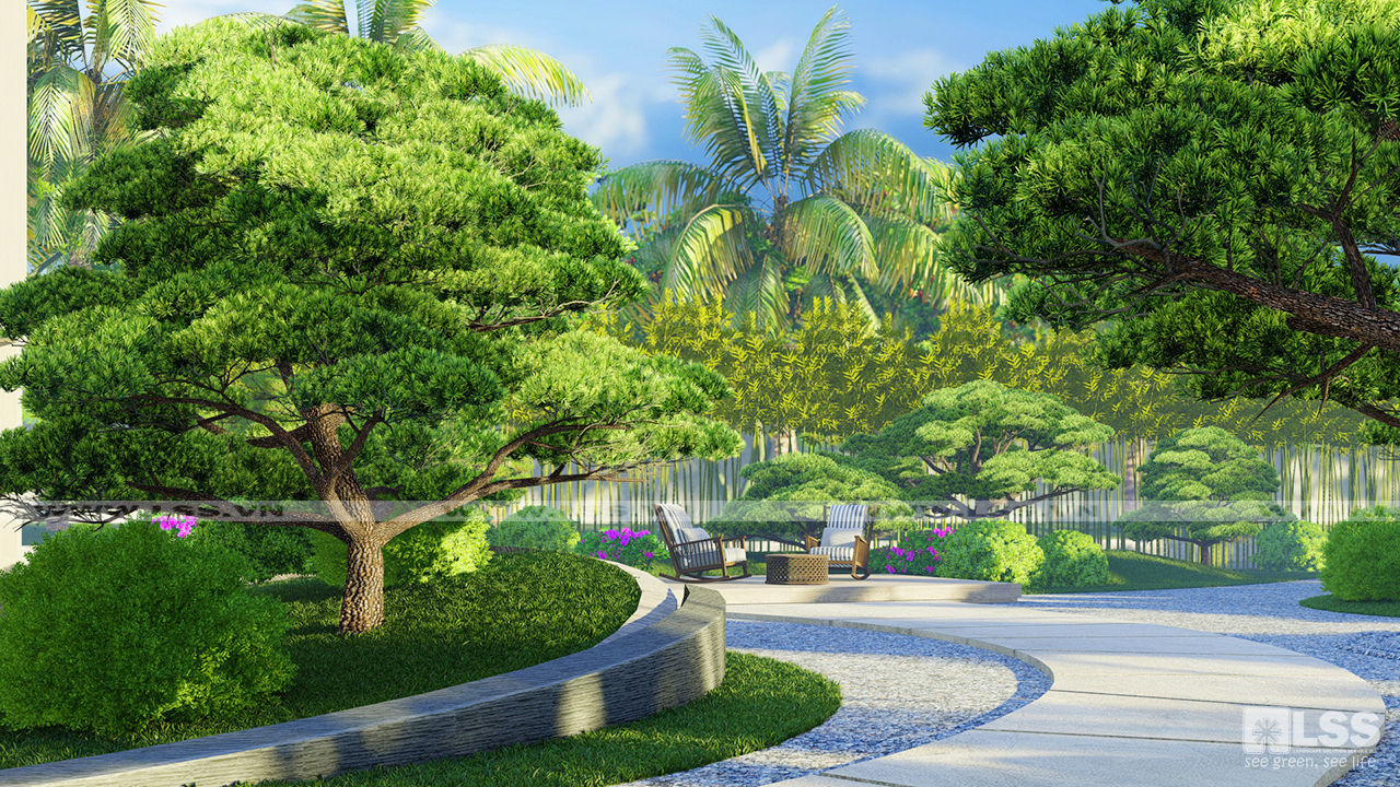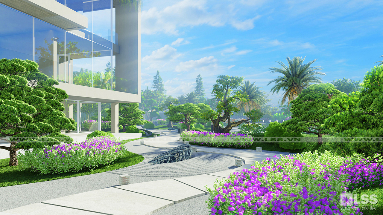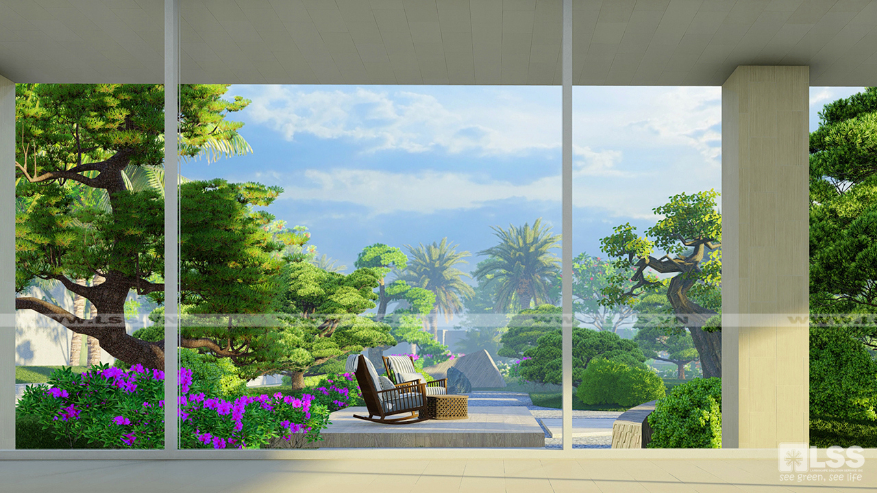 Cây cảnh xung quanh chủ yếu là các giống cây quen thuộc ở châu Á, đặc biệt là khu vực vườn Nhật Bản với những hình ảnh đậm chất thiền như sỏi, đá, các giống cây bonsai quý chính là điểm lắng đọng hiếm có của khu vườn, mang đến 1 không gian “sống chậm” đầy ấn tượng.