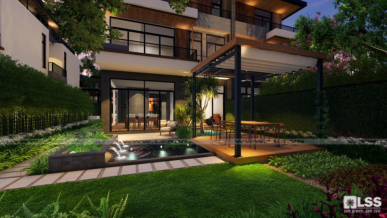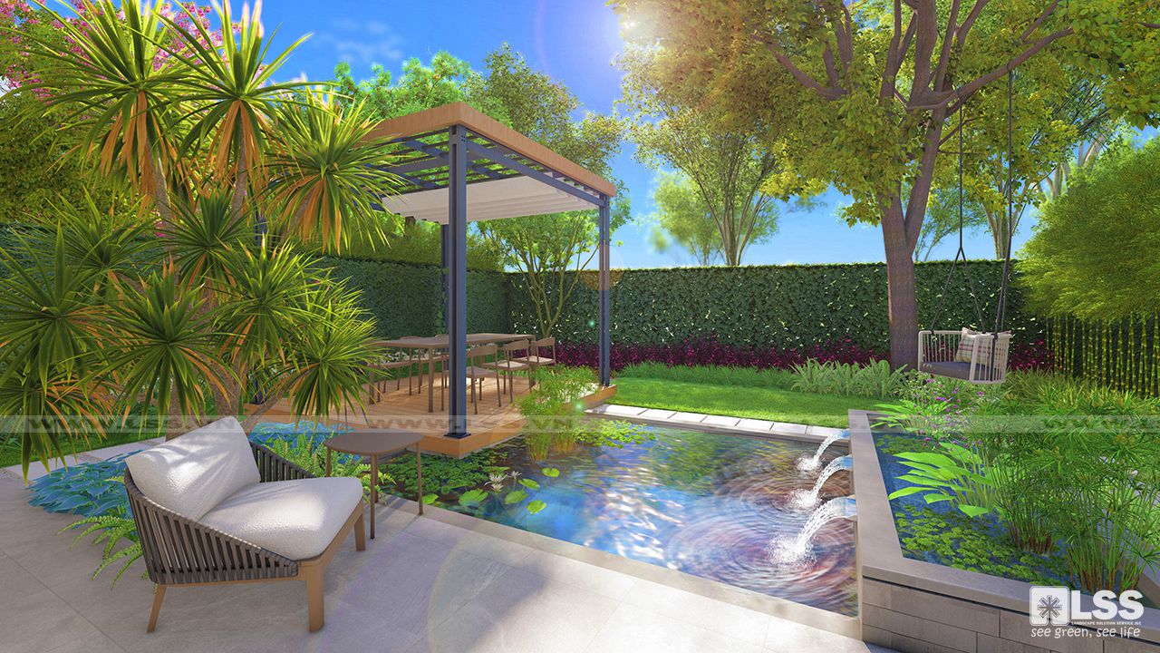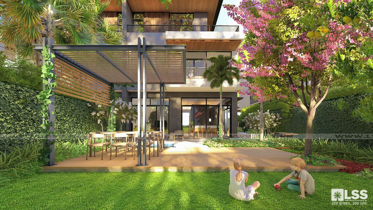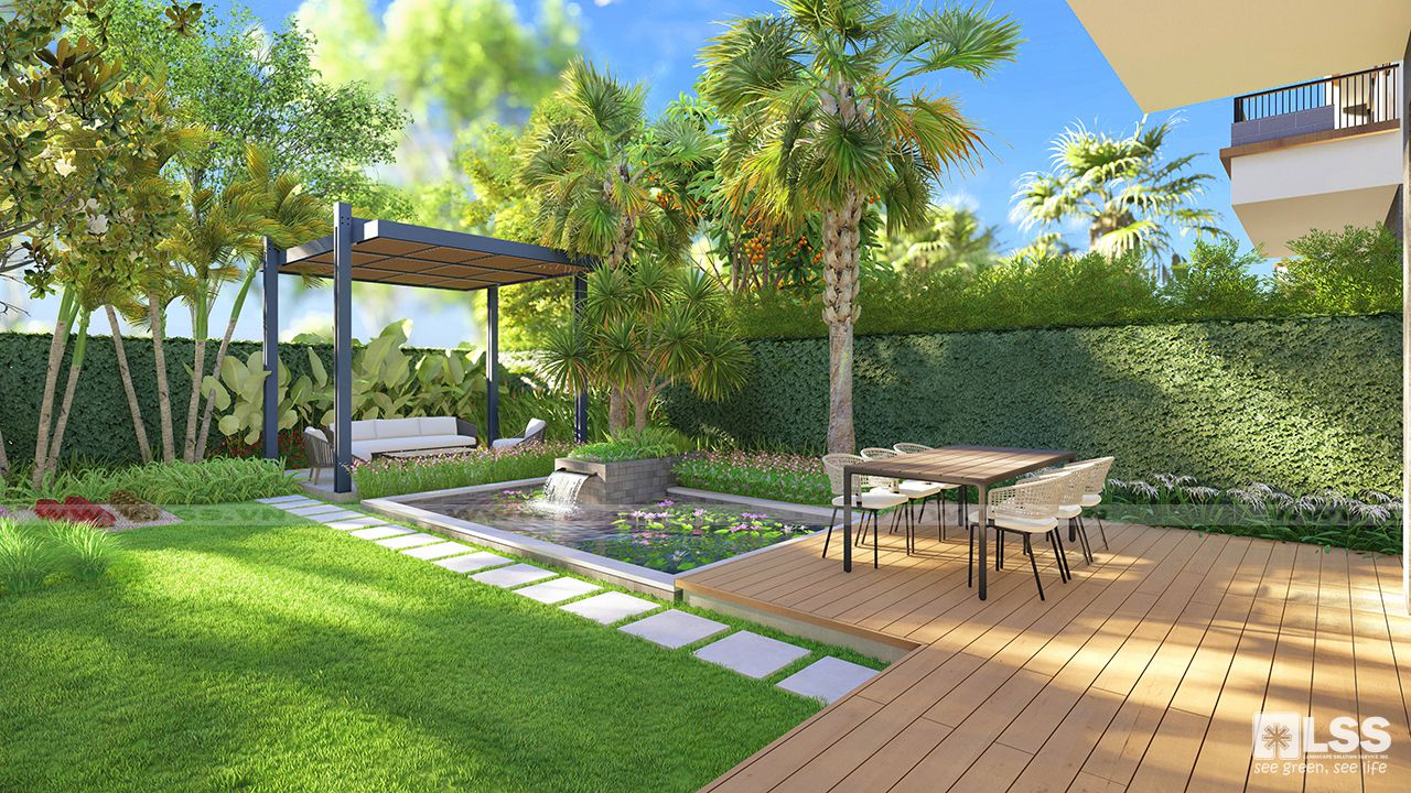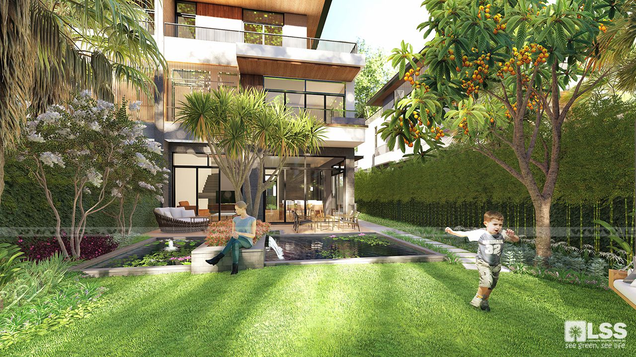 Với tư duy thiết kế mới mẻ phóng khóang, đây là hình thức dễ mang lại nhiều thiện cảm và sự lựa chọn cho gia chủ. LSS áp dụng đường nét kỷ hà vuông vức để mang đến bố cục gọn gàng cho thiết kế. Đồng thời các bãi cỏ lớn được tận dụng triệt để nhằm tạo không gian thoáng đã và nhiều ánh sáng cho khu vườn.