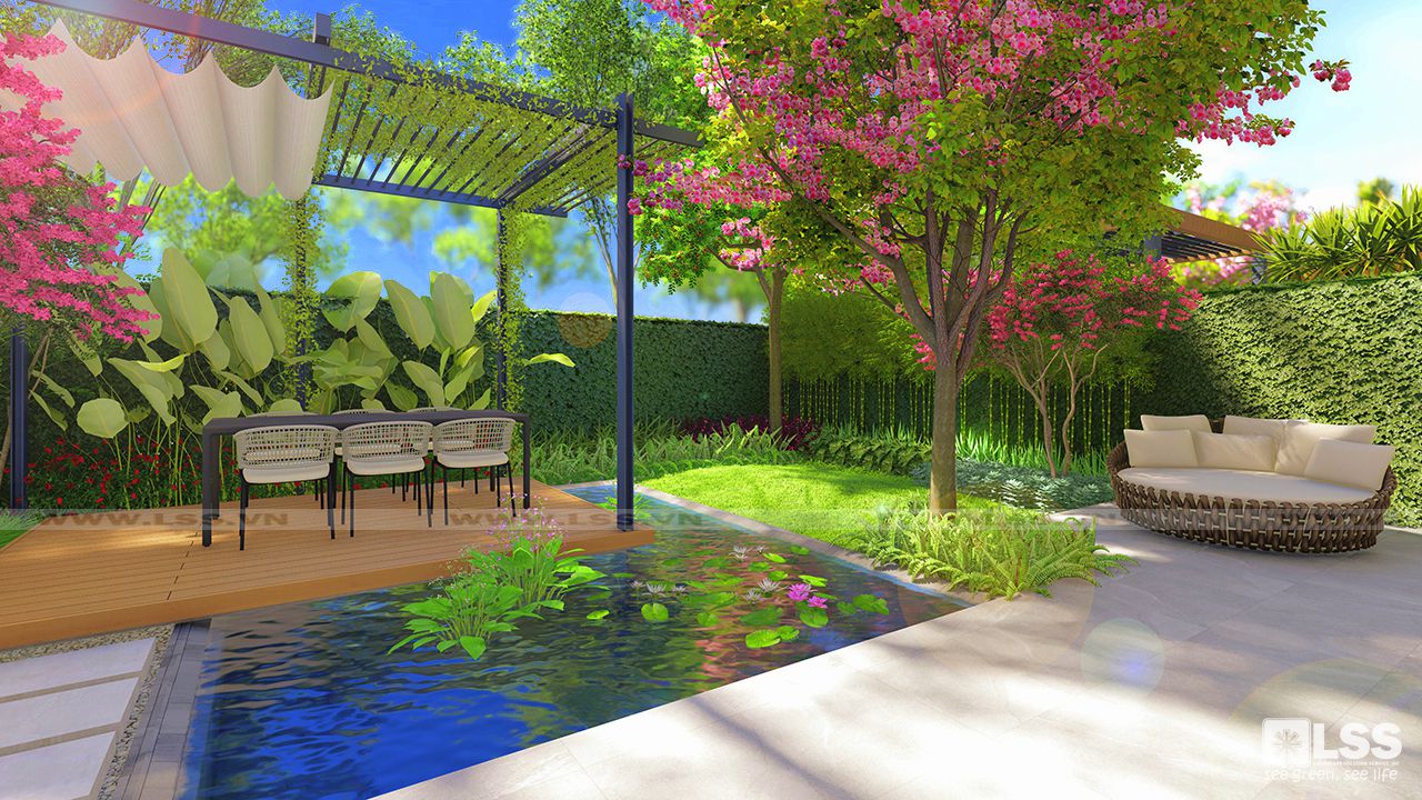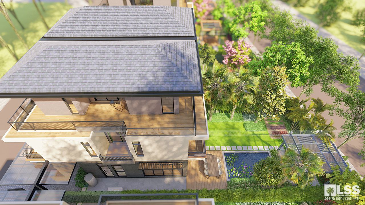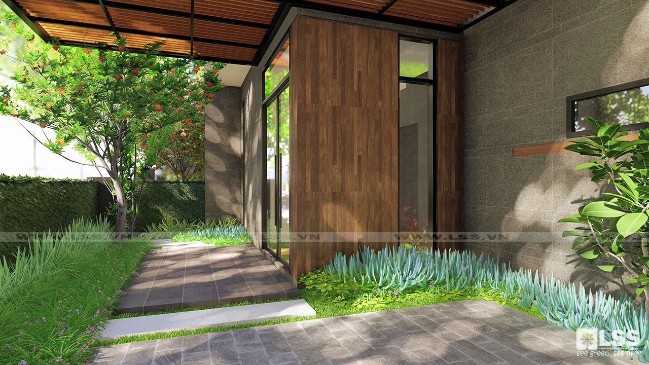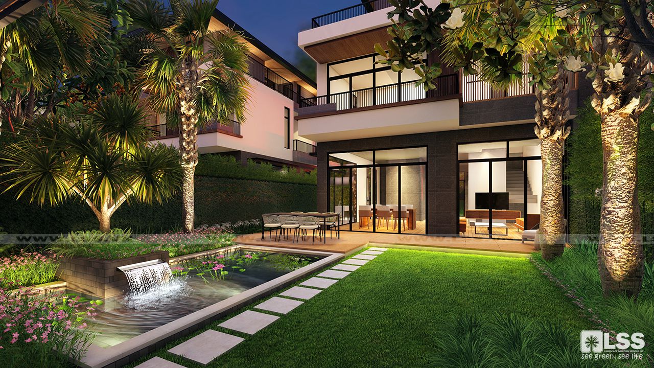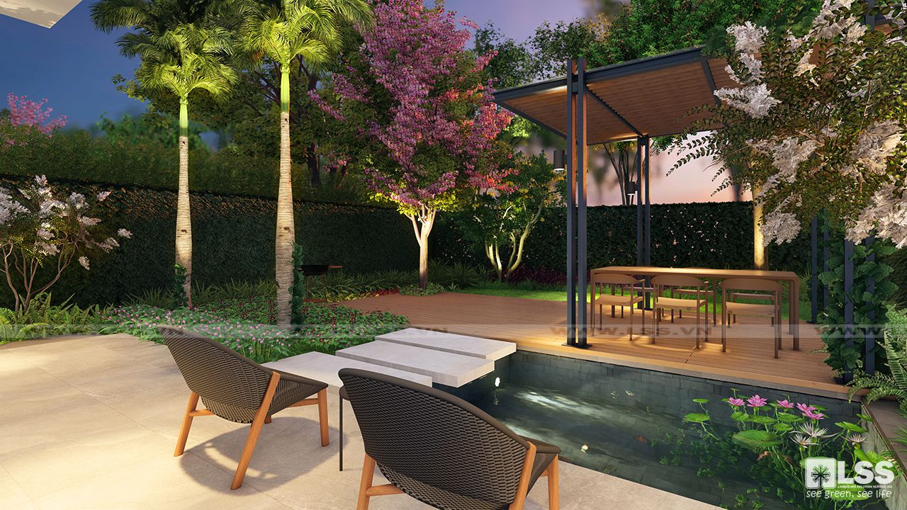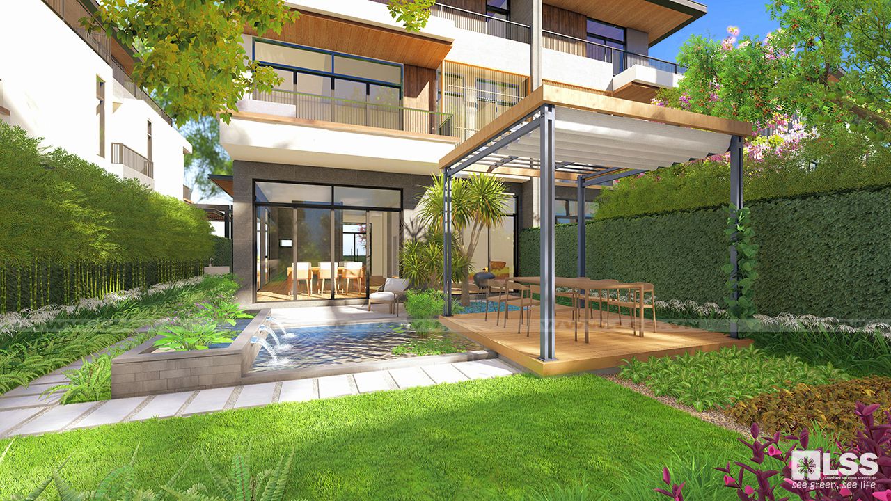 Với tư duy thiết kế mới mẻ phóng khóang, đây là hình thức dễ mang lại nhiều thiện cảm và sự lựa chọn cho gia chủ. LSS áp dụng đường nét kỷ hà vuông vức để mang đến bố cục gọn gàng cho thiết kế. Đồng thời các bãi cỏ lớn được tận dụng triệt để nhằm tạo không gian thoáng đã và nhiều ánh sáng cho khu vườn.