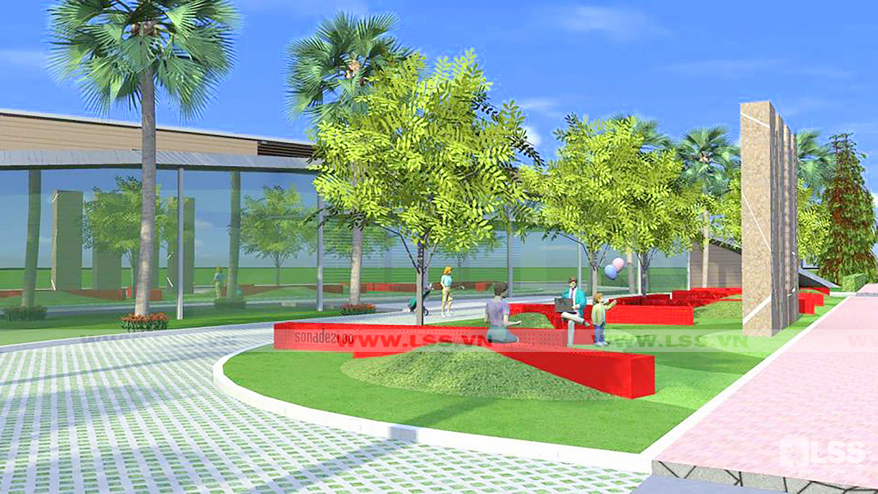Điểm nhấn đặc biệt nhất là mái xanh của khối nhà dịch vụ. Tận dụng hình khối kiến trúc hiện đại, LSS phủ xanh toàn bộ mái bằng thảm cỏ – xu hướng bền vững đang được ưa chuộng trên thế giới. Giải pháp này không chỉ giảm bức xạ nhiệt mà còn tạo sự liên kết mềm mại giữa cảnh quan mặt đất và kiến trúc công trình. Các cụm cây tiểu cảnh bố trí bên dưới góp phần tăng chiều sâu và sức sống cho toàn bộ mặt tiền.