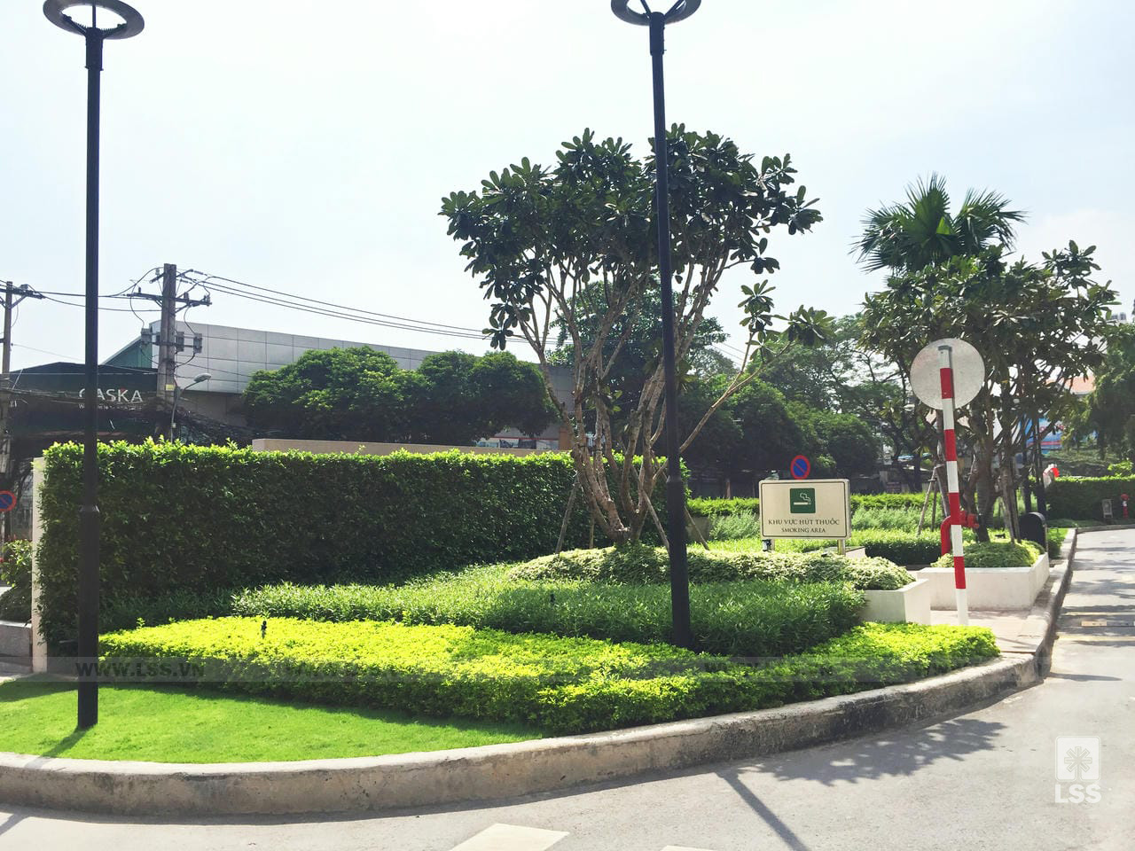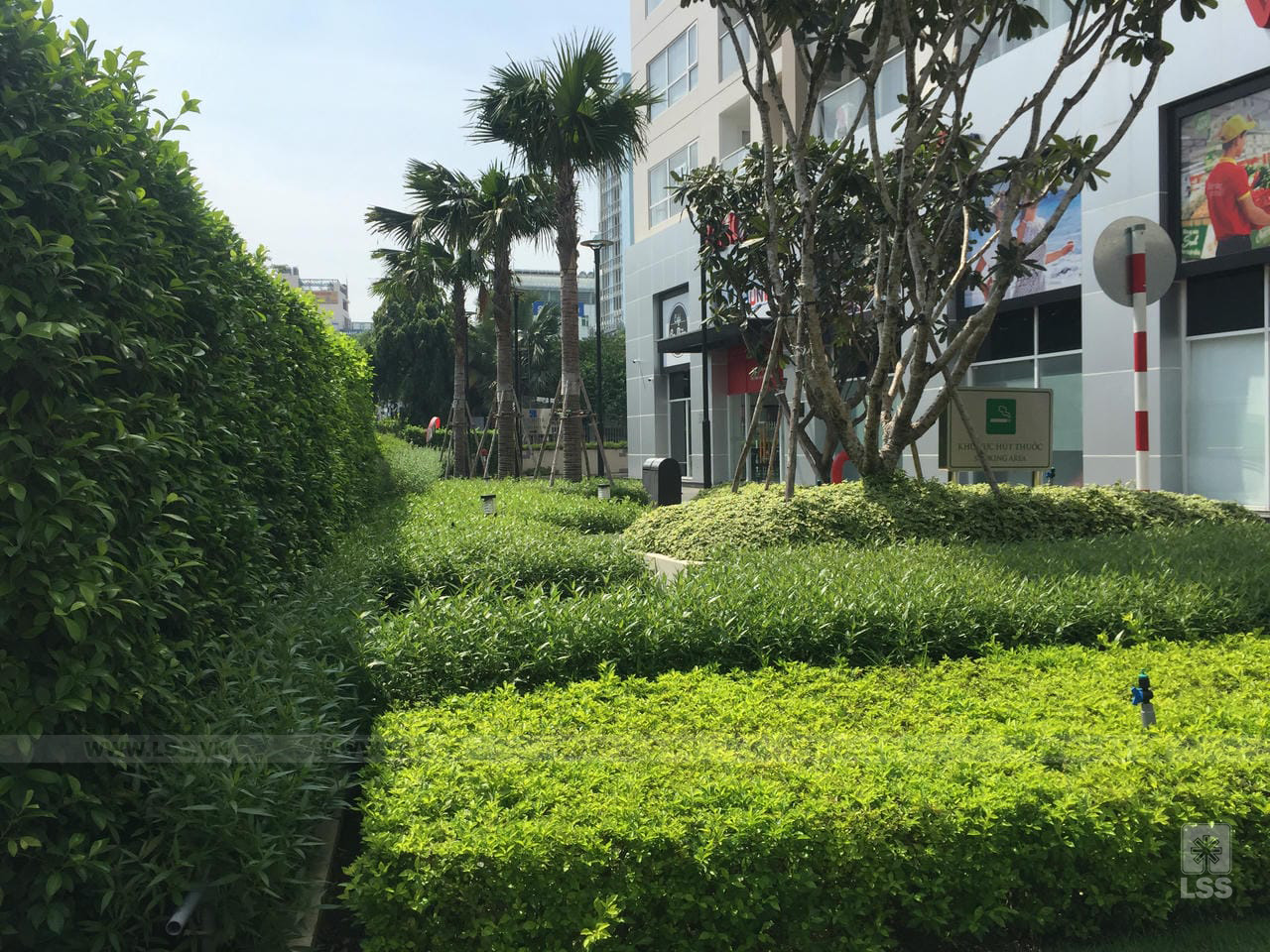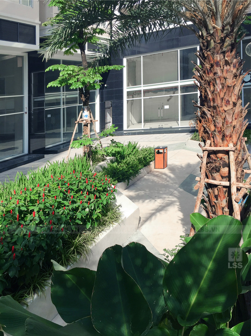 Mật độ cây trồng cao, chủ yếu là các loại cây lá lớn, tán dày không chỉ tạo hình ảnh xum xuê mà còn giảm bớt tiếng ồn trong khu vực phễu bay.Các cá thể chà là được trồng quanh khu vực hồ bơi được LSS lựa chọn sao cho hình dáng đều đặn, tán cây xum xuê tạo nên cảm quan như đang trầm mình giữa một bãi biển nhiệt đới đầy thú vị. Không chỉ quan trọng các khu vực khuôn viên chính, LSS còn rất quan tâm đến hệ thống mảng xanh dọc hàng rào và vỉa hè dự án. Các cây lớn như sứ, cau được chọn lọc kỹ lưỡng kèm các cây bụi cắt tỉa gọn gàng mang đến một hình ảnh thân thiện mà vẫn rất chuyên nghiệp khu tổng thể căn hộ.