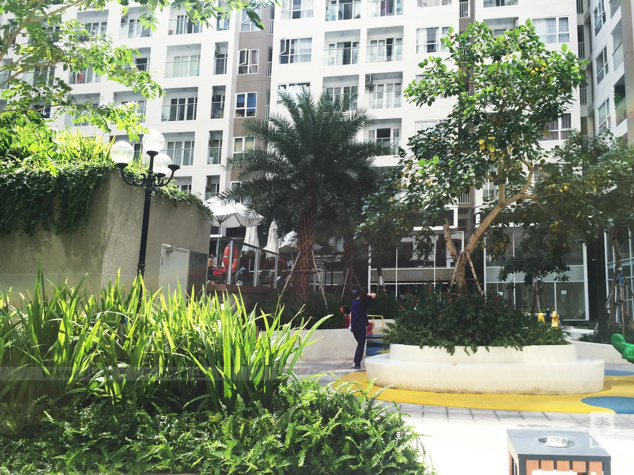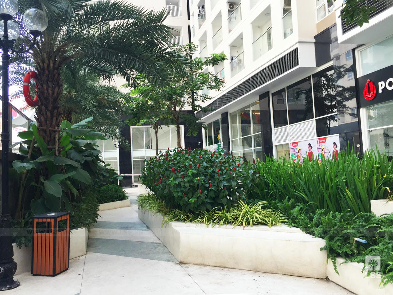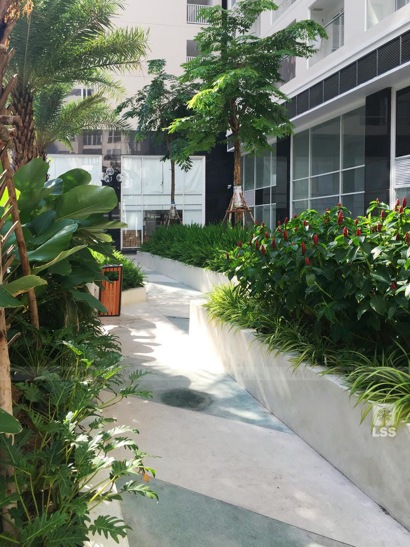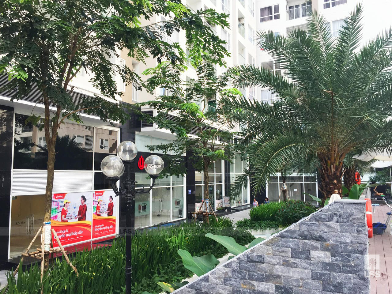 Mật độ cây trồng cao, chủ yếu là các loại cây lá lớn, tán dày không chỉ tạo hình ảnh xum xuê mà còn giảm bớt tiếng ồn trong khu vực phễu bay.Các cá thể chà là được trồng quanh khu vực hồ bơi được LSS lựa chọn sao cho hình dáng đều đặn, tán cây xum xuê tạo nên cảm quan như đang trầm mình giữa một bãi biển nhiệt đới đầy thú vị. Không chỉ quan trọng các khu vực khuôn viên chính, LSS còn rất quan tâm đến hệ thống mảng xanh dọc hàng rào và vỉa hè dự án. Các cây lớn như sứ, cau được chọn lọc kỹ lưỡng kèm các cây bụi cắt tỉa gọn gàng mang đến một hình ảnh thân thiện mà vẫn rất chuyên nghiệp khu tổng thể căn hộ.