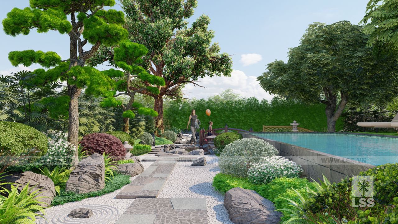 Không gian cảnh quan sân vườn biệt thự được bố trí hài hòa với các thành phần như bể cá Koi, hồ bơi, vườn Karasensui, hồ sen, khu vực sàn uống trà, vườn rau, đường dạo,…