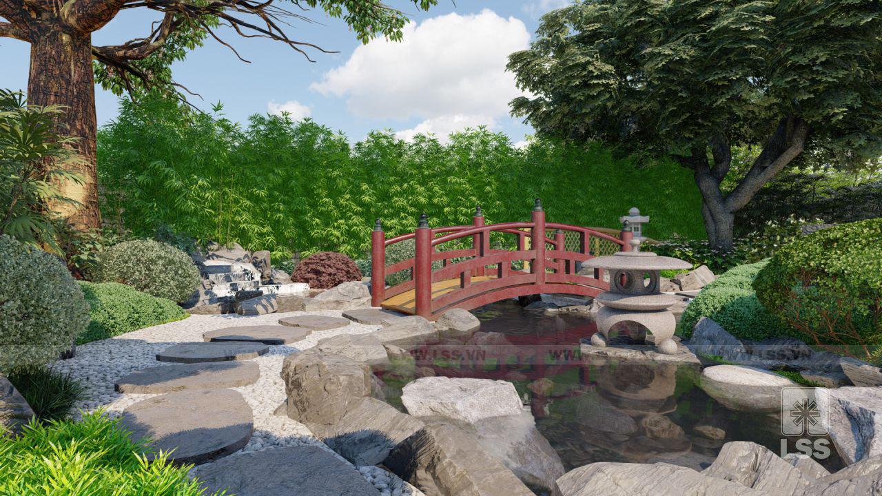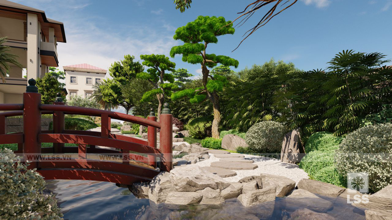 Ngay từ khu vực lối vào đã được các Kiến trúc sư LSS chăm chút từng chi tiết bằng nghệ thuật vườn khô Karasensui đầy an yên, với đá tượng trưng cho núi, sỏi tượng trưng cho nước, cùng những phiến đá Nobedan và Tobi-ishi dẫn dắt bước chân vào thế giới của xứ sở Phù Tang. Khu vực hồ cá Koi liên kết liền mạch với vườn khô, bao gồm thác đổ, cầu gỗ đỏ, đèn đá và cây tỉa bon sai đậm đà chất Nhật mang lại sự thanh bình và thư giãn cho không gian.