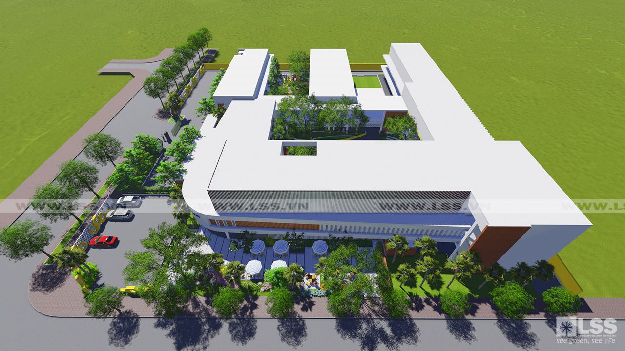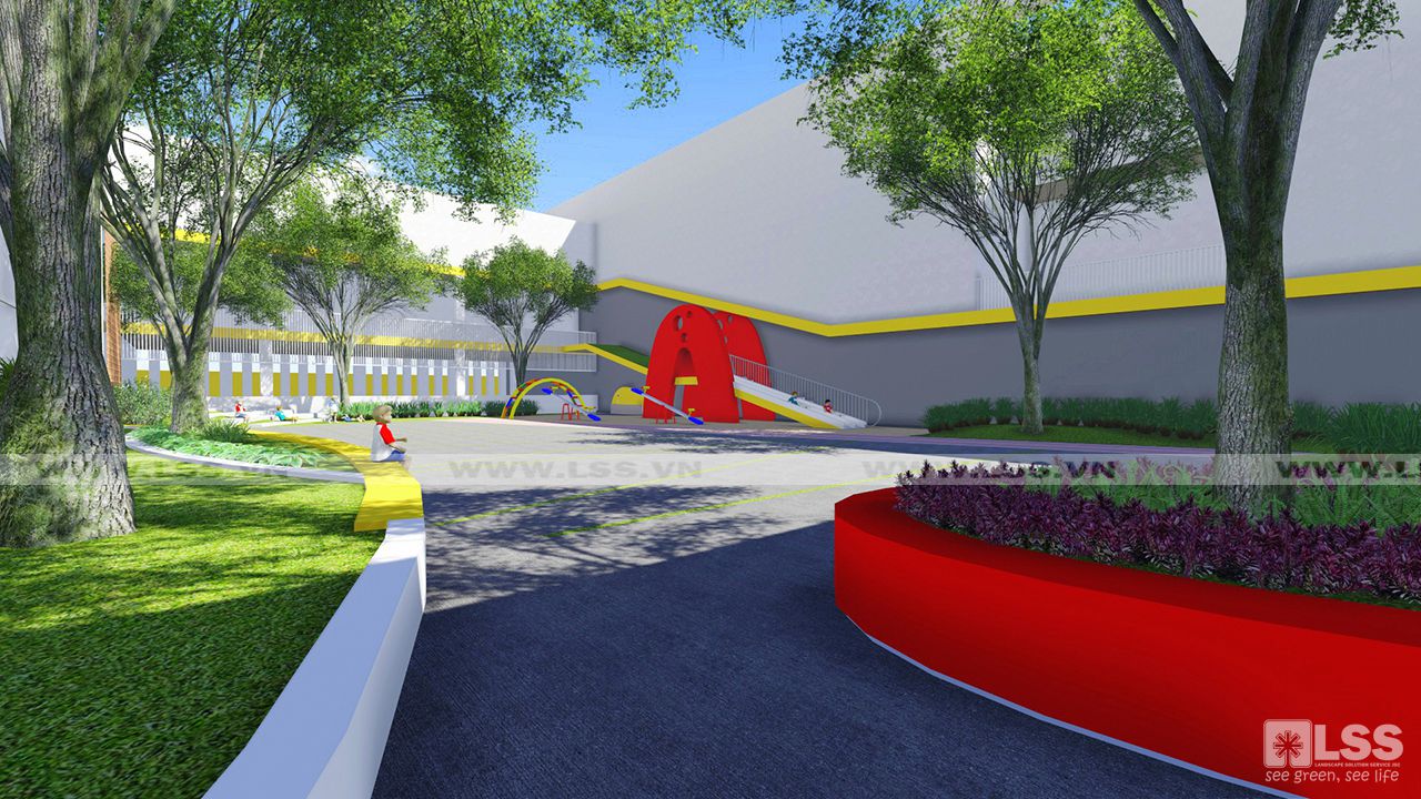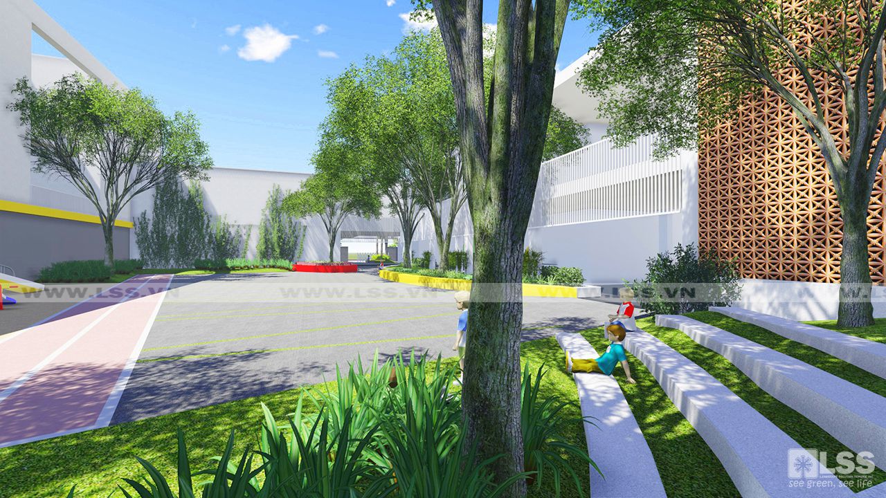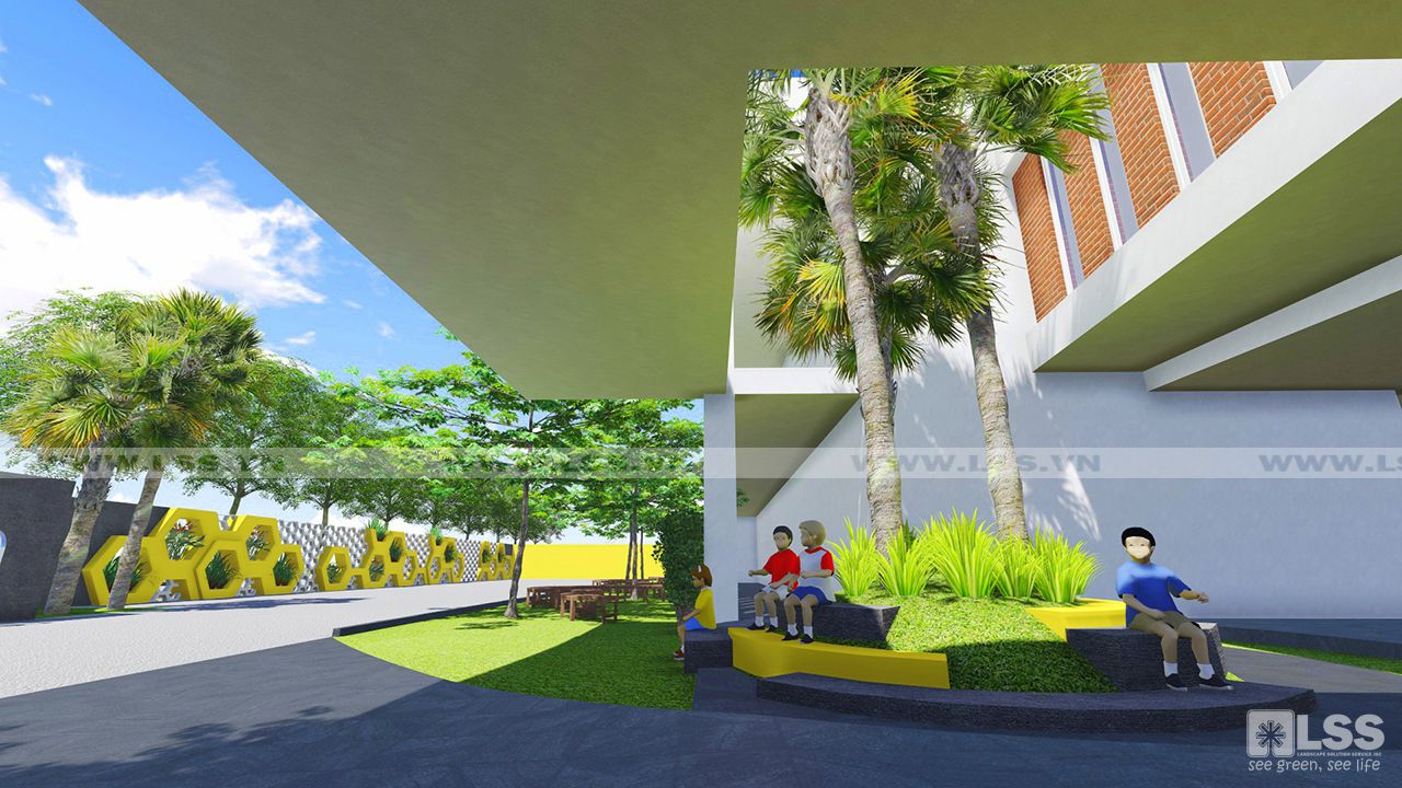 Bên trong, cảnh quan được tổ chức sinh động: sân lát đá xen ron cỏ hình lục giác, bồn hoa tổ ong kết hợp bệ ngồi, sân cỏ sọc ngẫu hứng như “bản nhạc vui tươi”. Các khu vực sân chơi được chú trọng an toàn với vật liệu thân thiện, cây xanh bố trí mềm mại và cụm cây bụi điểm xuyết. Đặc biệt, khu vui chơi trung tâm có pergola, ghế ngồi vòng tròn và sân khấu mini, khuyến khích trẻ vừa học vừa chơi, tăng cường kỹ năng giao tiếp trước đám đông.