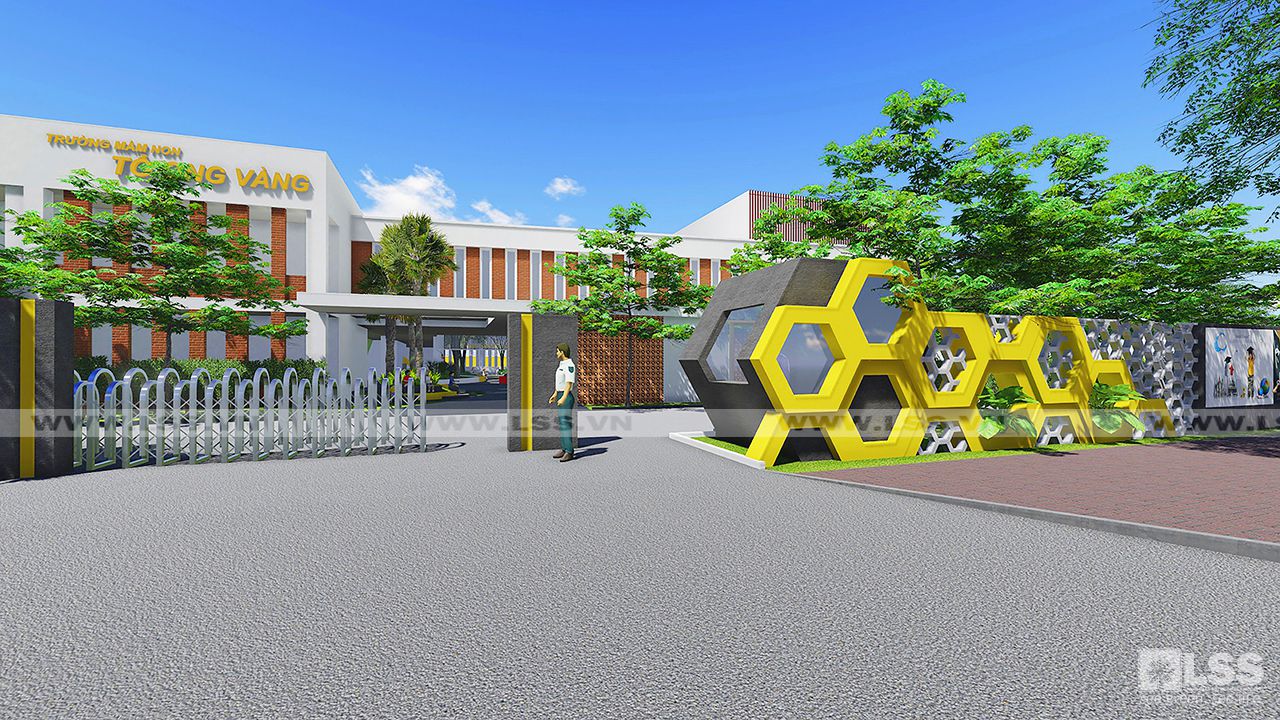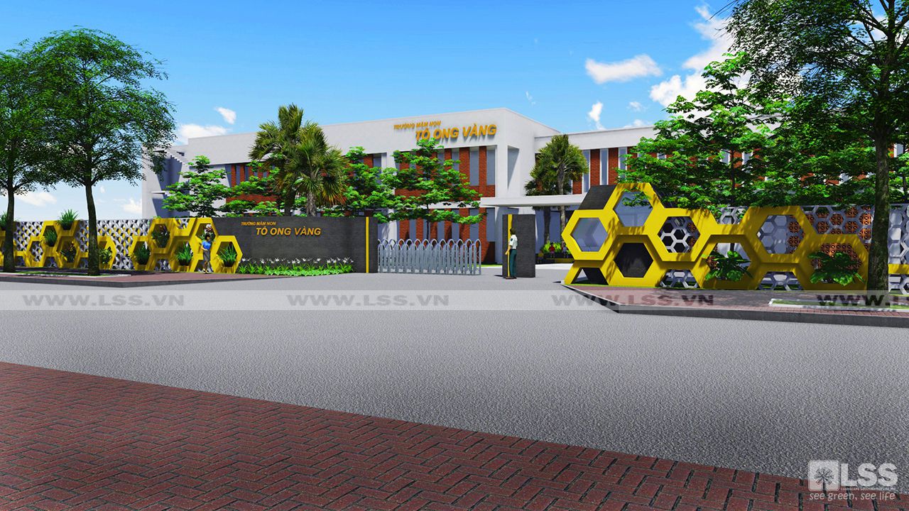 Đơn vị LSS được tin tưởng giao thiết kế và thi công cảnh quan với yêu cầu tạo nên một không gian “không giống bất kỳ trường mầm non nào khác”. Lấy cảm hứng từ hình ảnh tổ ong – biểu tượng của sự gắn kết và chăm chỉ – các kiến trúc sư đã khéo léo lồng ghép chi tiết này vào toàn bộ công trình. Ngay khu vực cổng rào, khối hoa gió lục giác kết hợp cùng những tổ ong vàng rực nổi bật, nhà bảo vệ tạo hình “tổ ong xanh” trở thành điểm nhận diện đặc trưng.