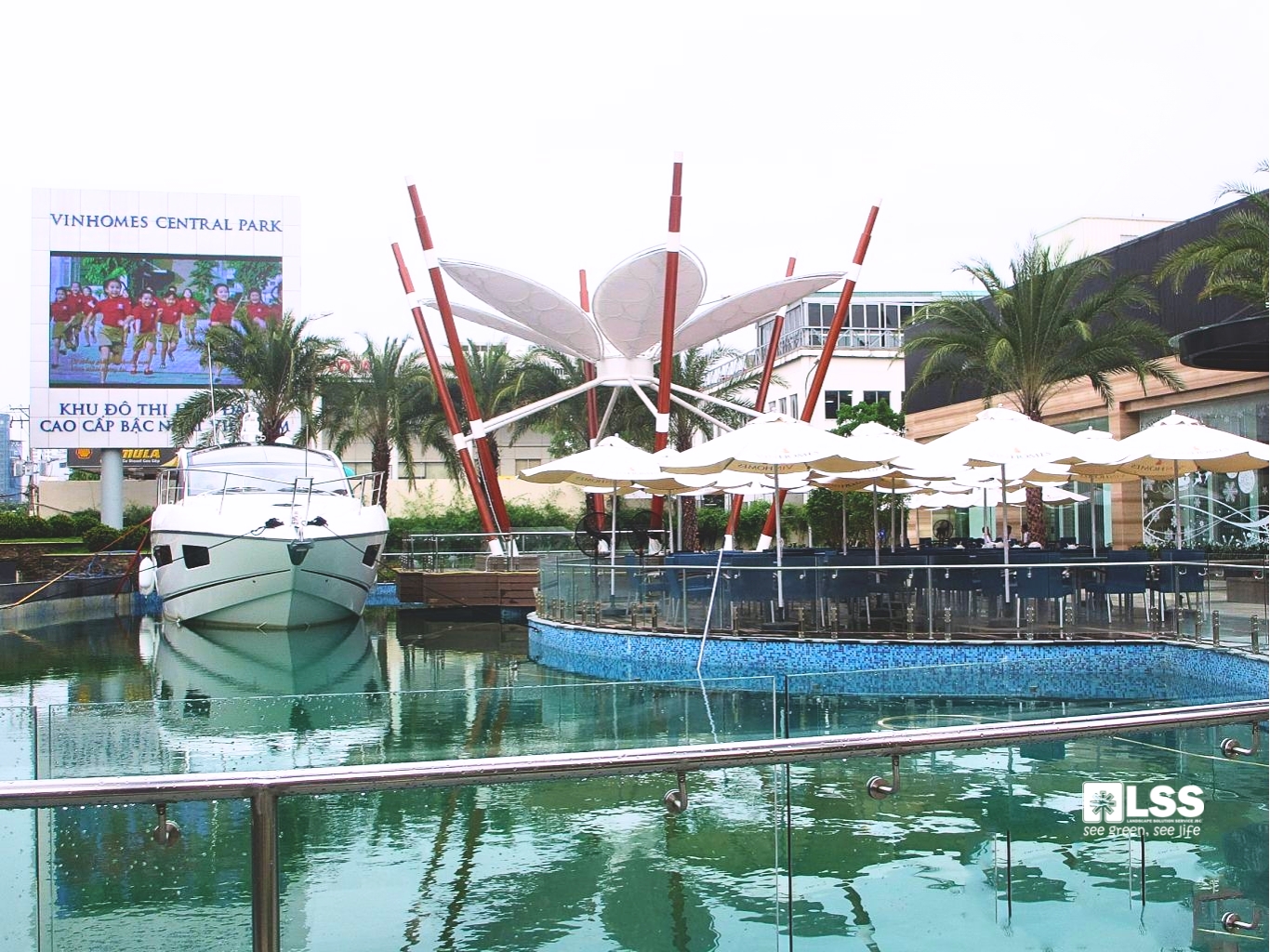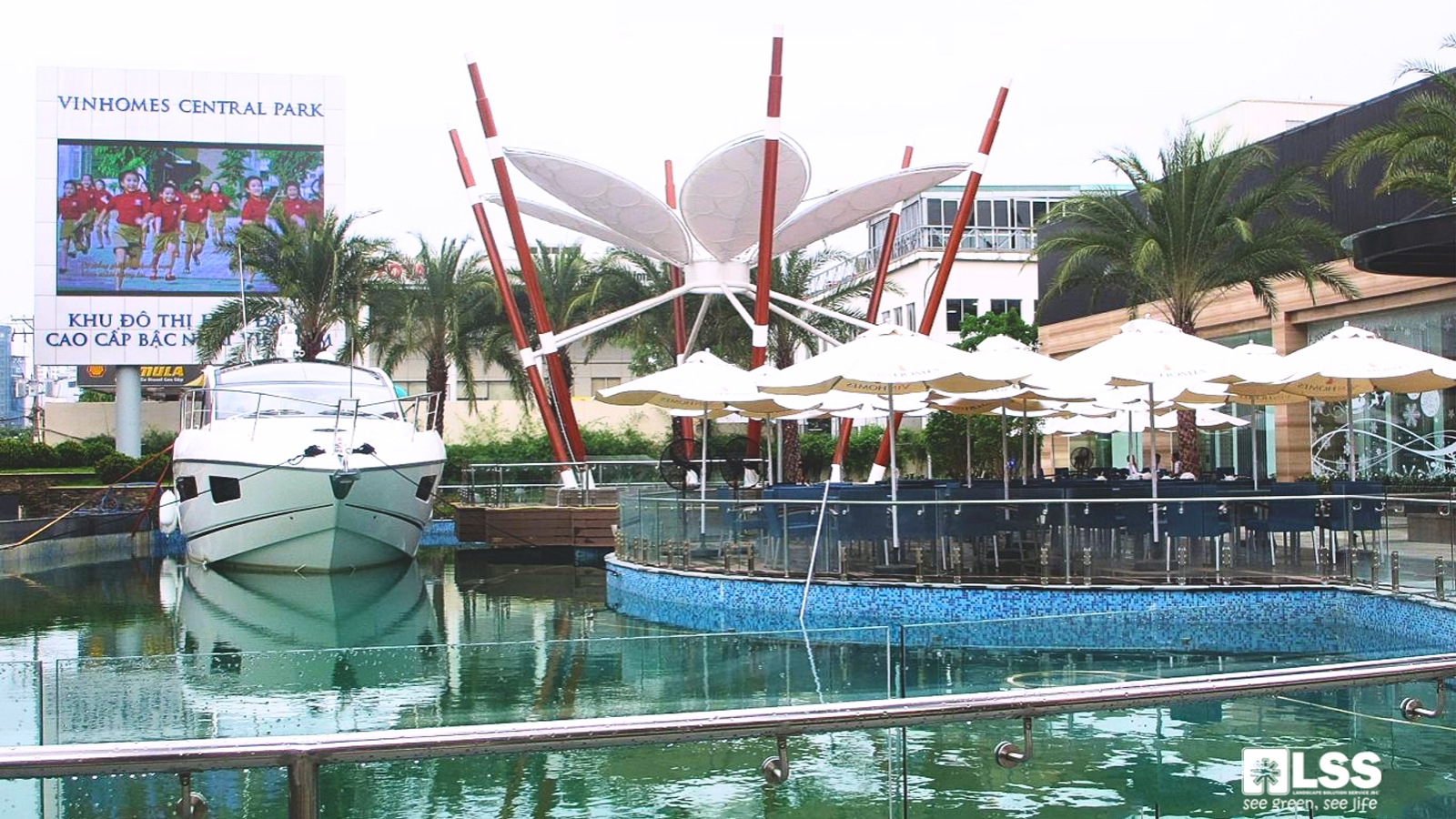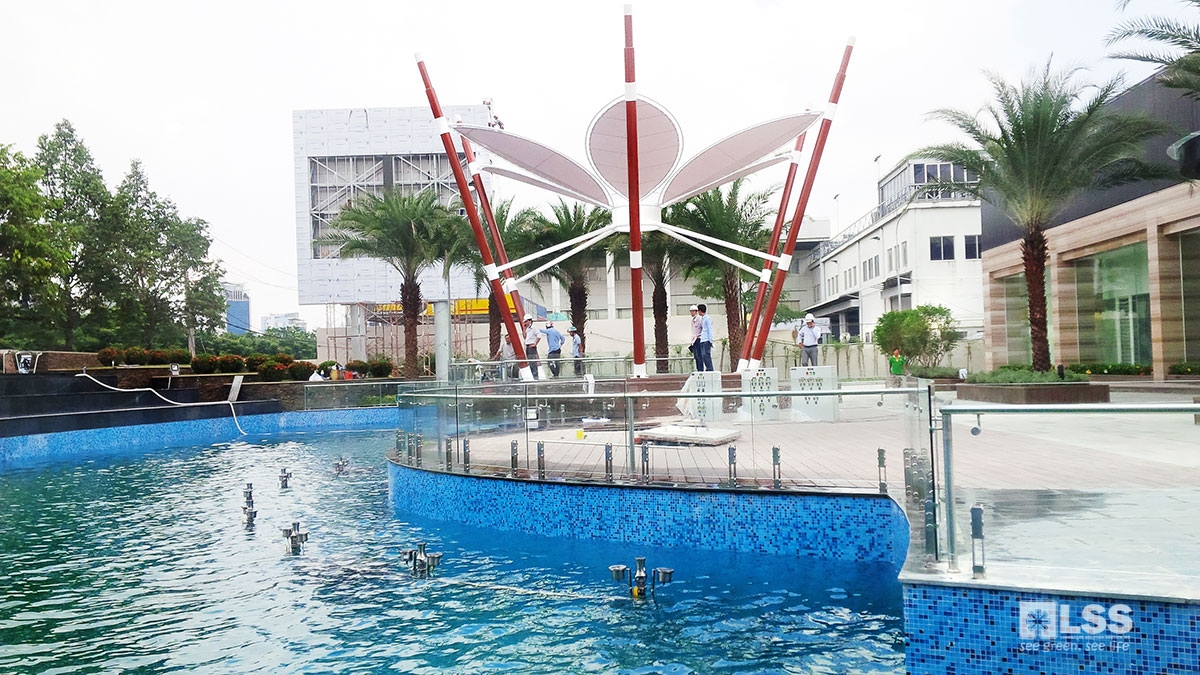 Một điểm nhấn đặc biệt là hệ thống cung đường dạo trên cao, cao khoảng 3m, uốn lượn qua cây xanh và mặt nước, đem lại trải nghiệm dạo bộ độc đáo chỉ thấy ở các đô thị hiện đại thế giới. Lan can kính cường lực, cột trụ thẩm mỹ tạo nên sự an toàn và tinh tế. Bên cạnh đó, hai tòa landmark mang hình khối xoay tròn bung nở tượng trưng cho sự phát triển vượt bậc của khu đô thị. Vật liệu được lựa chọn hài hòa giữa hiện đại và truyền thống, khiến công trình nổi bật cả ngày lẫn đêm. Đặc biệt, việc trồng cây lớn ngay trên đỉnh tháp – vốn là thách thức trong thiết kế – đã được LSS thực hiện thành công, nâng tầm giá trị cảnh quan.