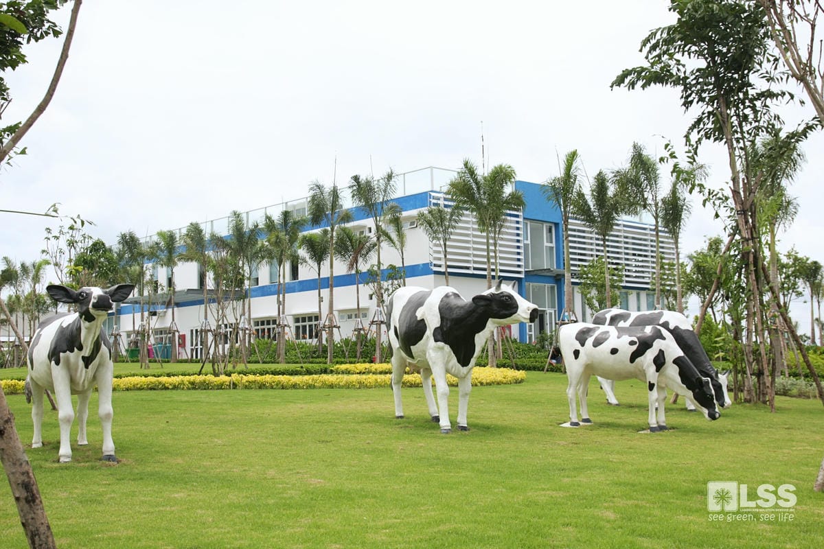Một trong các khu vực thu hút không kém chính là nơi trưng bày mô hình. Với tiêu chí nguồn sữa lấy từ những trang trại vật nuôi được chăm sóc tốt nhất, mô hình đàn bò do LSS cung cấp vừa đạt chuẩn về cảm quan vừa sinh động và bắt mắt mà sau này đã trở thành điểm điểm checkin siêu hot cho các đoàn khách đến thăm quan nhà máy sữa. Nếu nói khu công nghiệp thì không cần quan tâm đến độ thẩm mỹ mà chỉ cần đủ mật độ cây xanh theo quy định thì có lẽ đã quá “hời hợt” chăng? Với mục tiêu tạo dựng không gian tiện tích xanh -sạch -đẹp cho cán bộ công nhân viên nhà máy, tất cả các khuôn viên quanh nhà máy đều được LSS chăm chút kỹ lưỡng từ khâu thiết kế đến thi công hoàn thành. Bãi cỏ đậu xanh mướt lấp lánh ánh vàng, các góc tiểu cảnh thu hút với cây trồng rực rỡ, bố cục uốn lượn với đường nét tạo hình đẹp mắt đã thực sự mang đến một không gian xanh tuyệt đẹp cho khu công nghiệp.